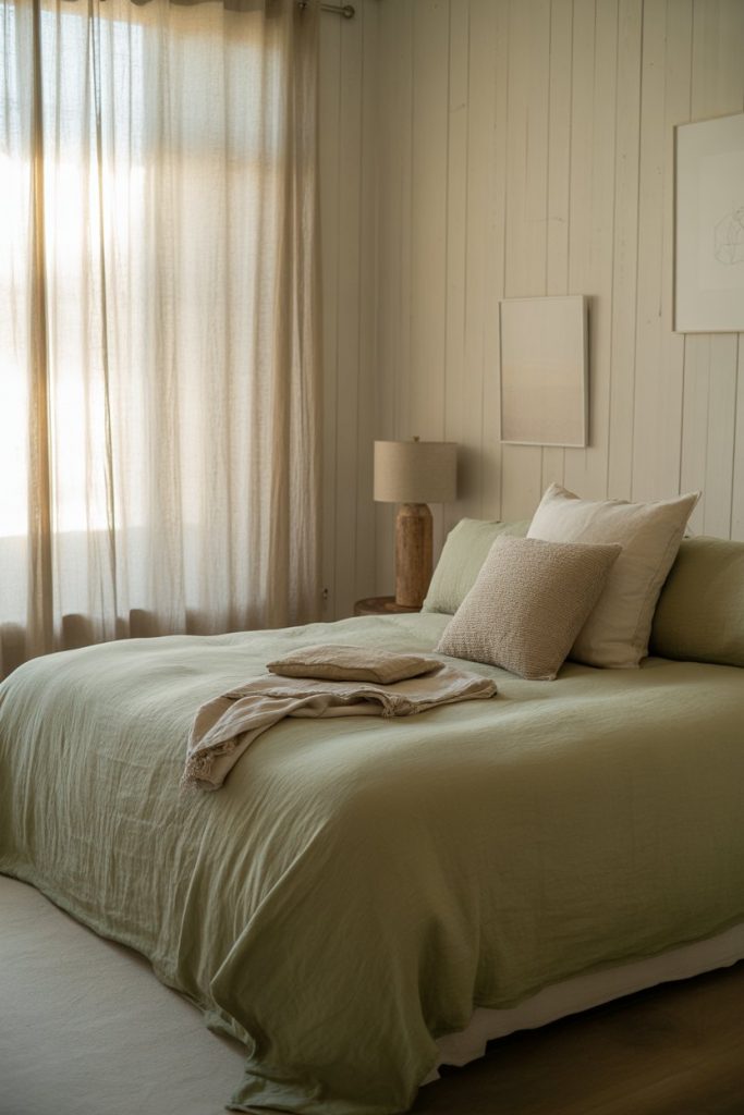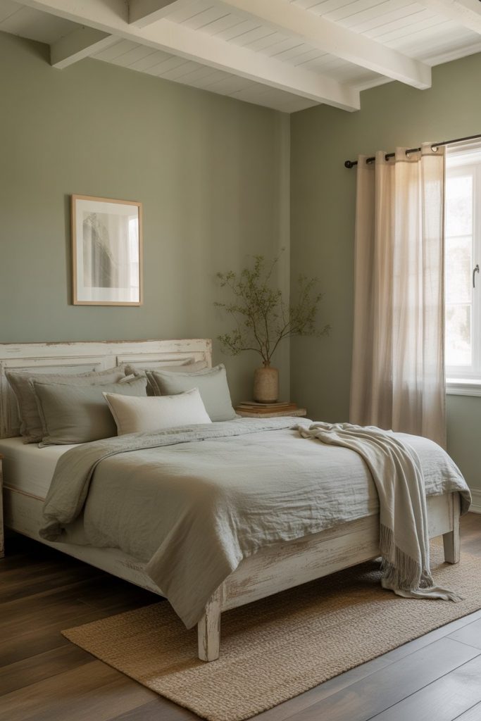Soft, sage green tones bring an earthy and tranquil vibe to farmhouse bedrooms. Perfect for small rooms, this shade keeps the space light while still feeling grounded. Pair it with whitewashed wood, vintage textiles, and linen drapery for a relaxed, nature-inspired retreat. The shade has been widely praised by designers like Studio McGee for its ability to feel both modern and timeless at once.