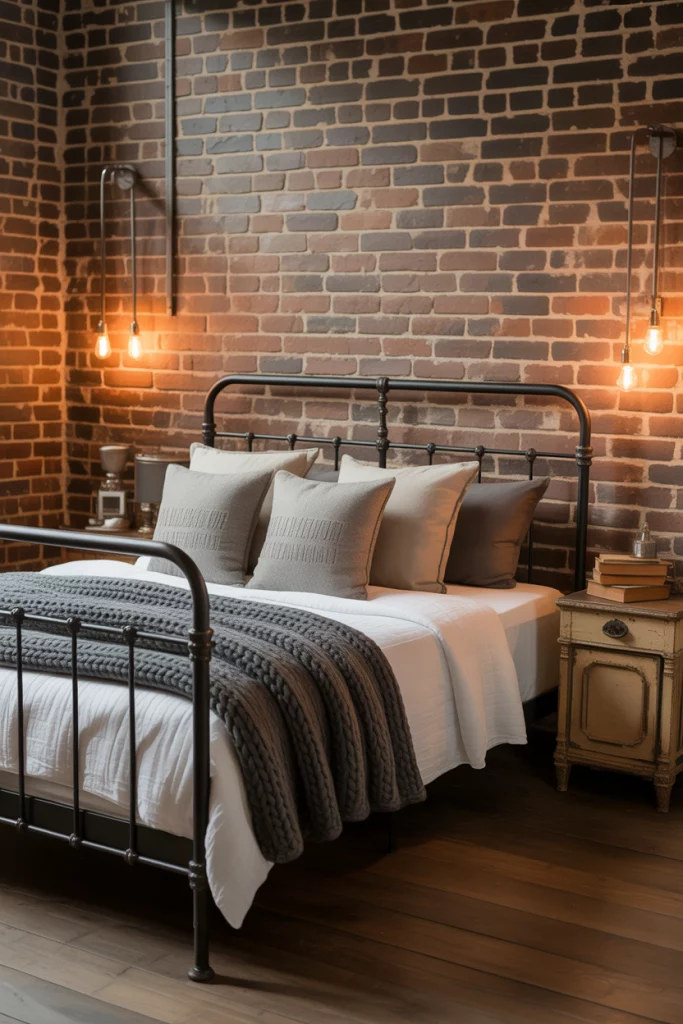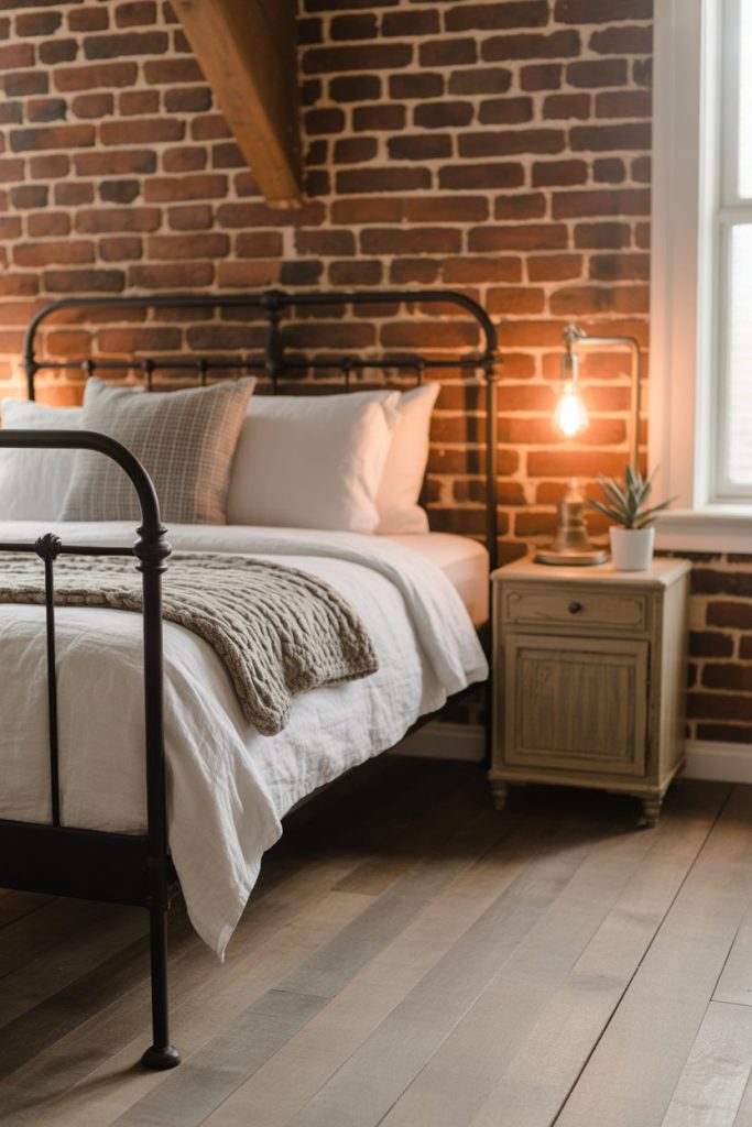 The industrial farmhouse bedroom adds character with black iron frames, exposed brick, and Edison bulb lighting. Combining these with rustic wood and cozy bedding keeps the style from feeling too harsh. Ideal for lofts or urban homes, this approach appeals to those who want farmhouse warmth with an edgy modern twist. Interior platforms like Houzz often highlight this mix as one of the most enduring design hybrids.