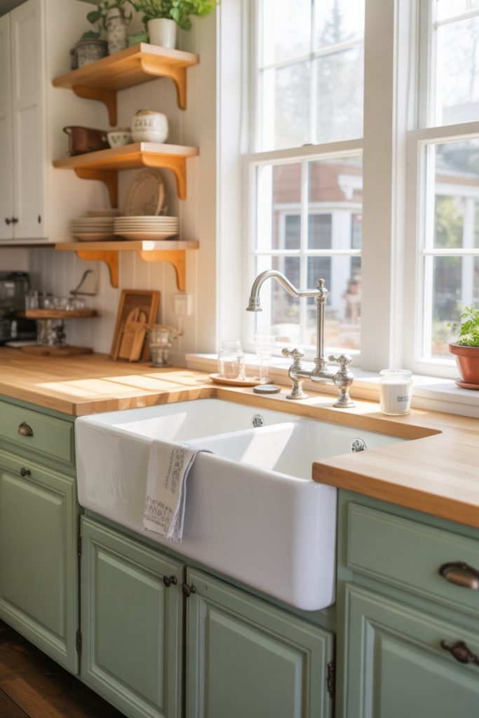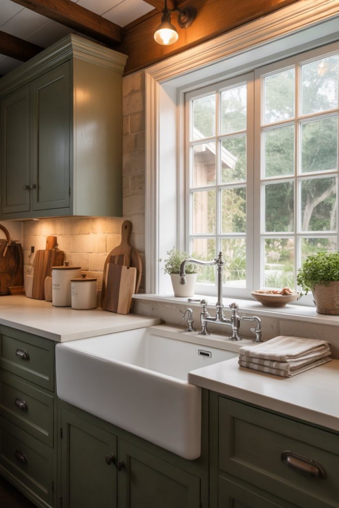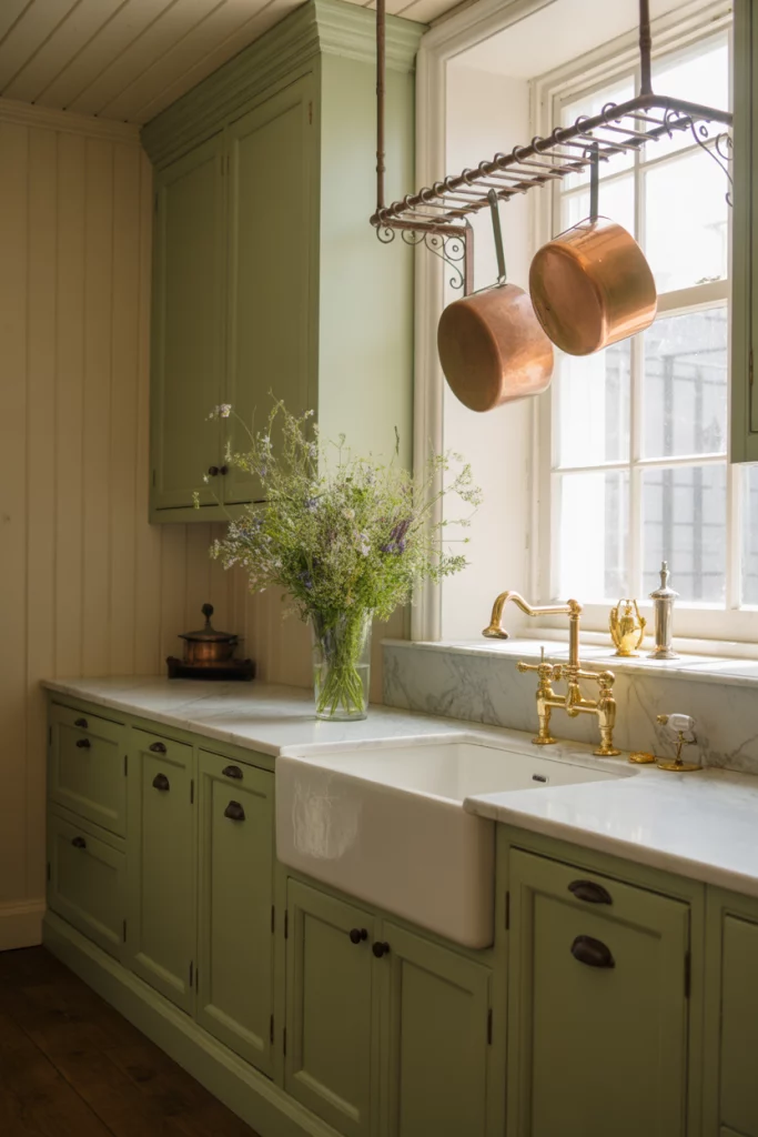 In 2026, green rules the farmhouse color palette. Sage or olive cabinet hues invoke a deep breath of fresh air and calm, contrasted by gleaming brass taps and a greenish marble. It’s nature coming indoors — stylish, sustainable, and soul-soothing.