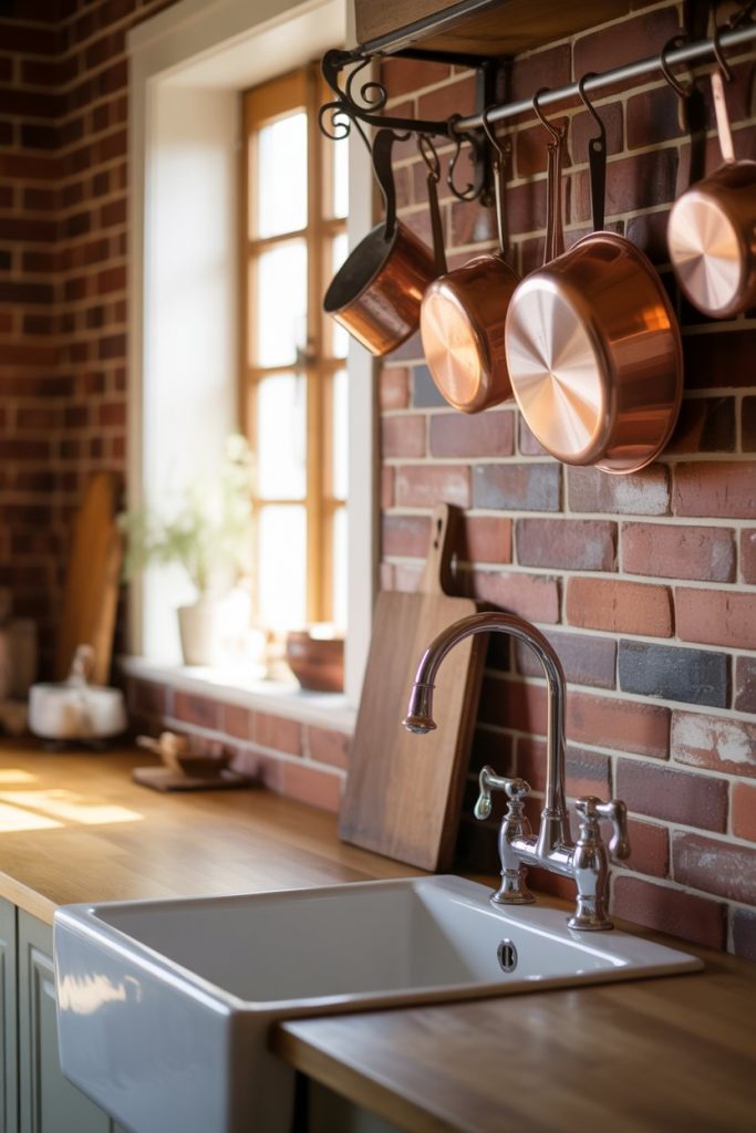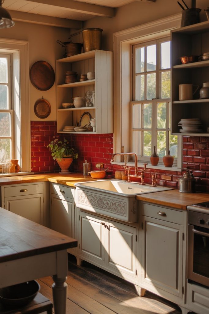 The red-brick backsplash is coming back as a nostalgic focus. It grounds the space by lending texture and warm detail that feels sincerely farmhouse. Combined with white cabinets, copper fixtures, and butcher block counters, this look balances respect for tradition and welcome comfort.