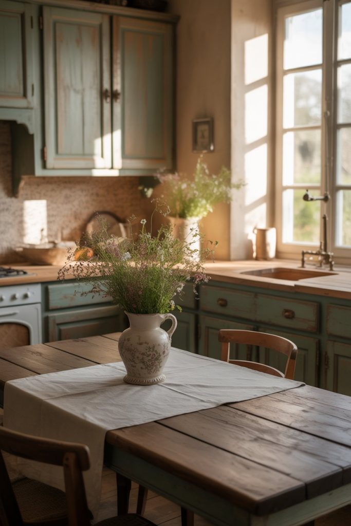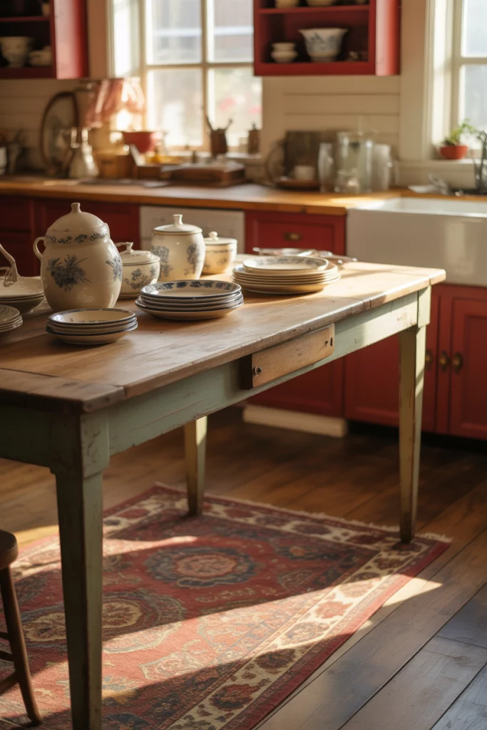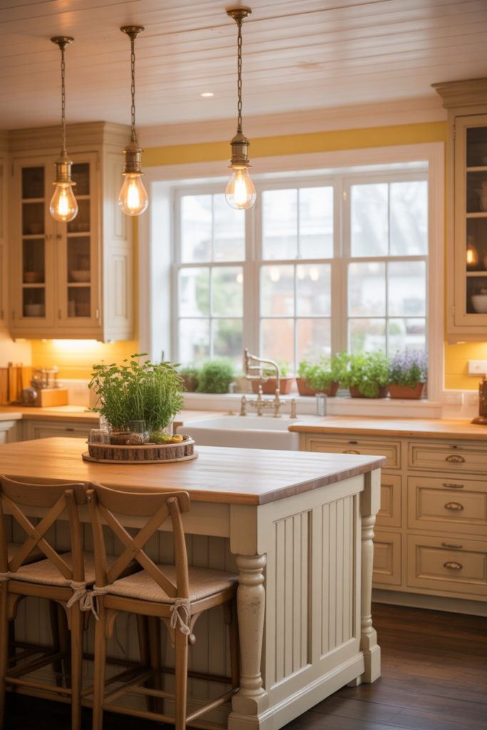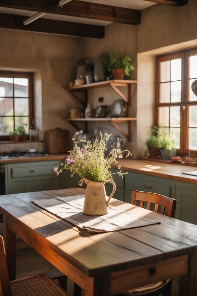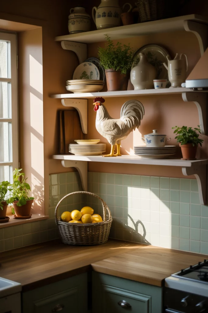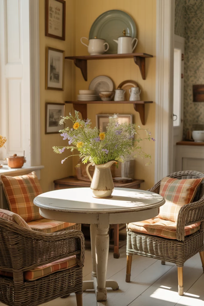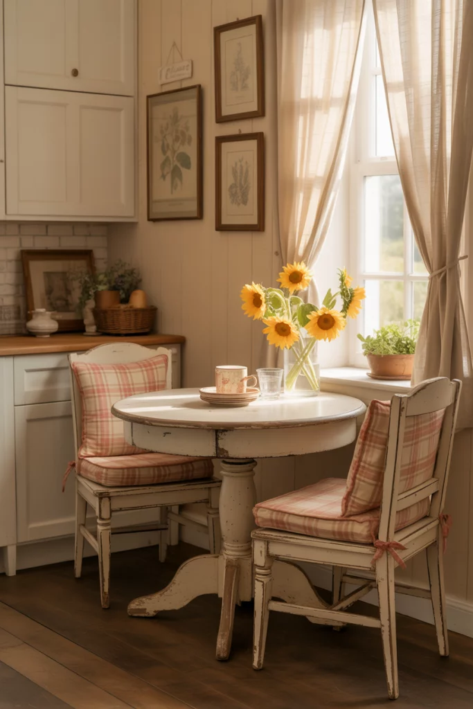 The heart of the country kitchen lies in gathering spaces. A built-in bench with plaid cushions near a sunny window makes mornings joyful. Pair the nook with a vintage table, soft throws, and pastel decor for a lived-in, cozy charm.