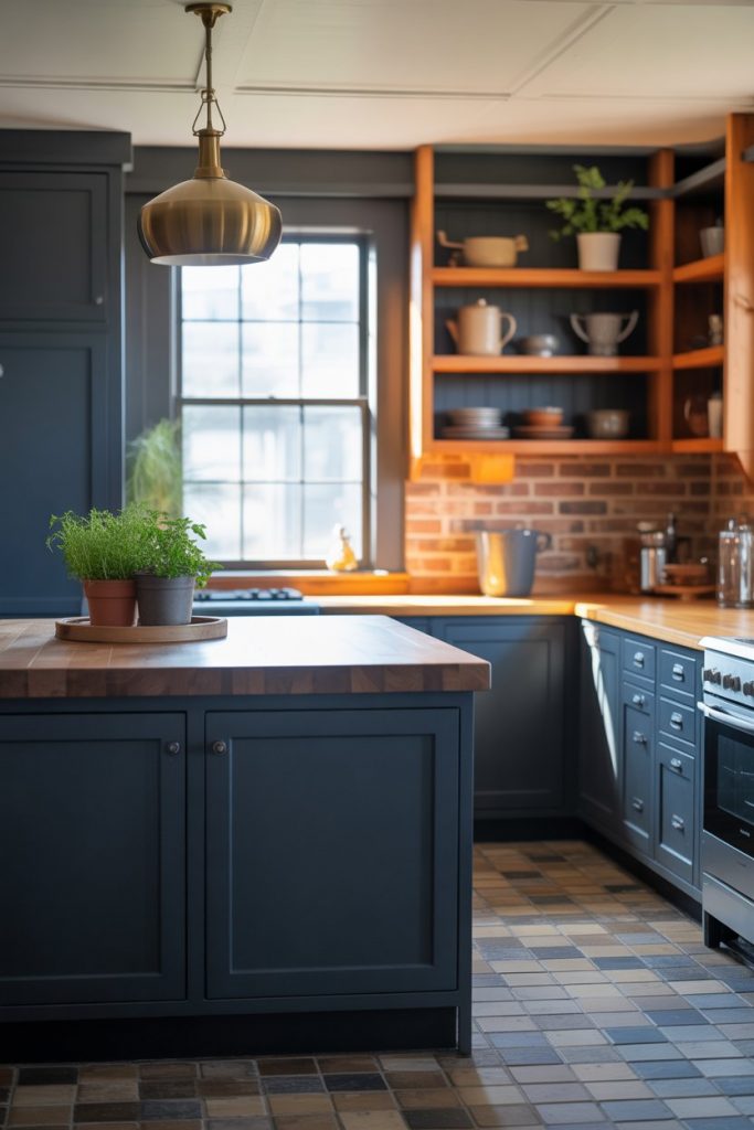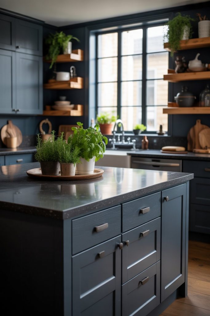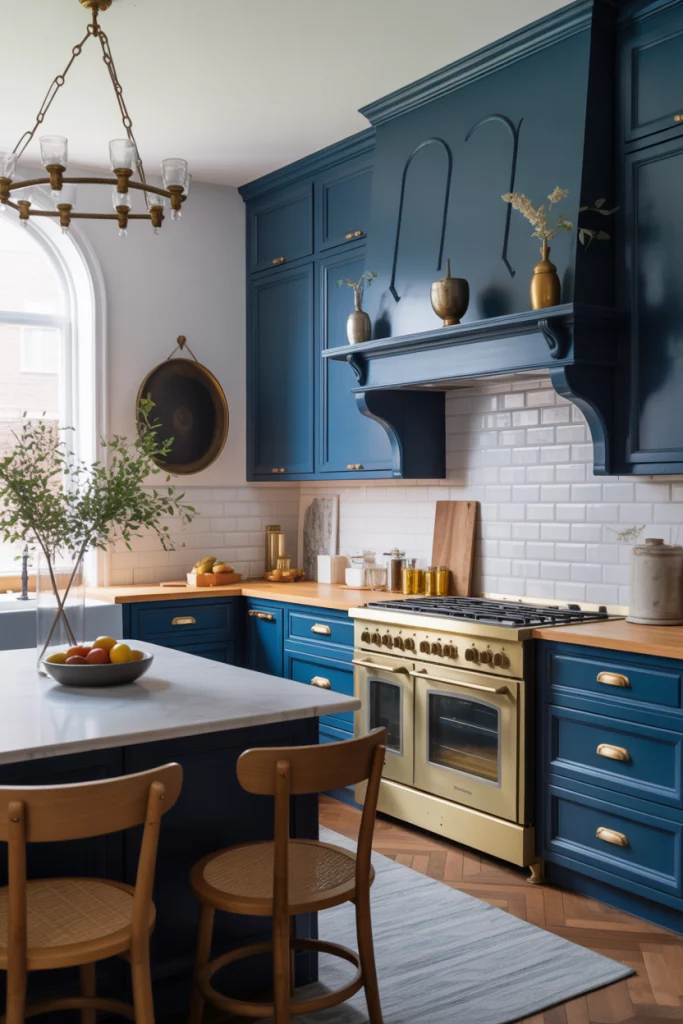 Deep blue cabinets bring a moody yet elegant twist to the farmhouse palette. They pair perfectly with brass handles and marble islands, adding coastal sophistication with a bold edge. This hue feels both timeless and artistic — modern farmhouse confidence at its best.