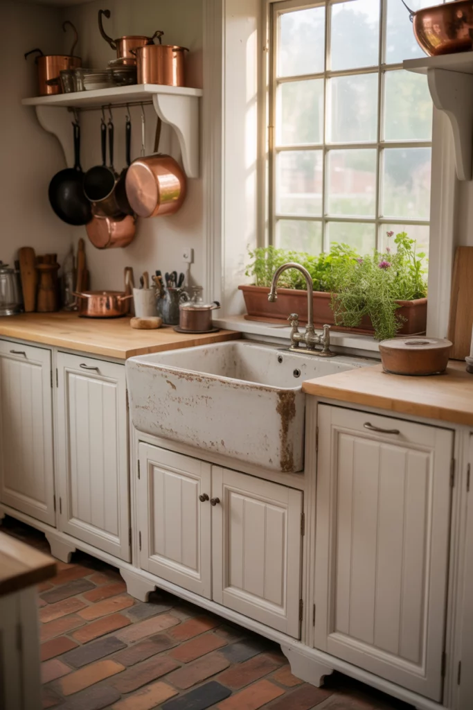 Will you remember tiles — brick is back underfoot in 2026 after all. Red-brick flooring adds an earthy patina to any country or European farmhouse kitchen. Coupled with soft-white cabinets and a vintage sink, it gives warm character that only grows richer with age.