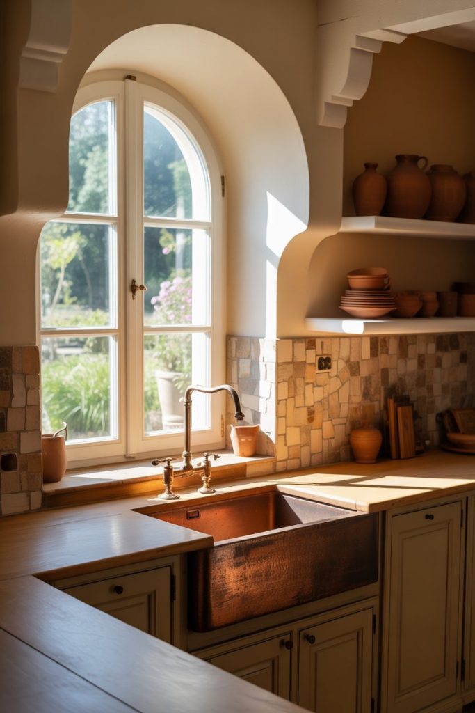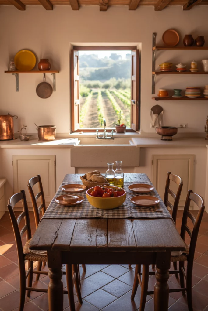 Italian-family kitchen resonates Mediterranean ease — open shelves, terracotta accents, and arched doorways. Rustic tables and wide-stone sinks lead to long family dinners that echo with laughter and warmth. This style celebrates simplicity, passion, and assembly.