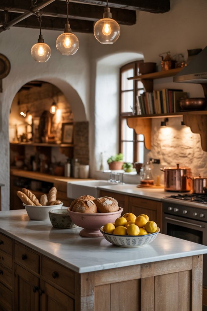 The European farmhouse in 2026 merges refinement with comfort. Ornate molding, stone backsplash, and arched alcoves create understated luxury. Add linen curtains, pottery, and warm lighting to balance old-world charm with modern ease.