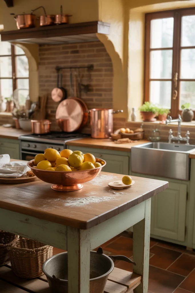 The vintage European style has complementary elements from Tuscan cottages and French farmhouses. Terracotta floors, brick backsplash, and ornate cabinetry add to levels to develop character, history, and atmosphere. Copper pans hang above that great big farmhouse sink; there’s that soulful, romantic, and enduring feeling — melting together so beautifully with a little bit of nostalgia and a lot of elegance.