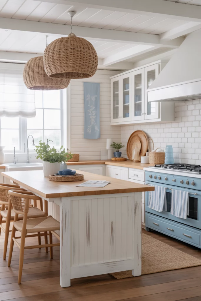 The coastal farmhouse trend translates oceanic tranquility into rustic warmth. Muted blues, whitewashed wood, and the casual linen decor spell seaside chic. Marble island and woven pendants confer just enough movement and ease for languorous mornings and all-afternoon convivi.