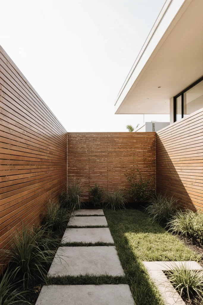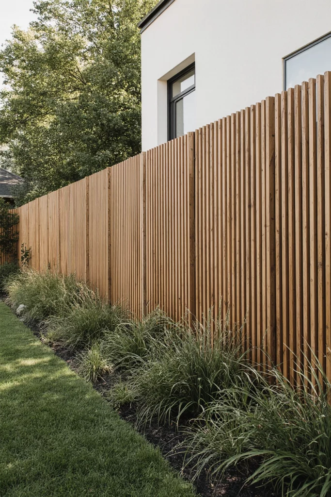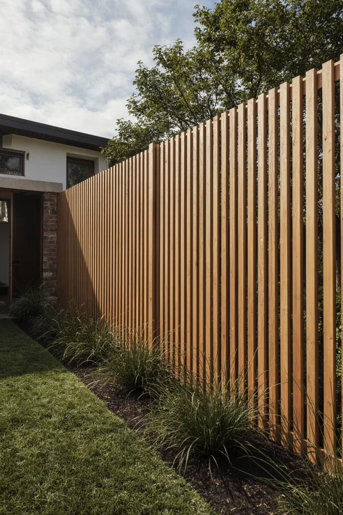 Tall vertical wood slats bring height and rhythm, especially in the front yard, where a wooden structure can feel sculptural and refined. This style references subtle Japanese influences while staying fully modern. Many outdoor stylists agree that vertical fencing works well when you want privacy that still breathes, giving airflow and elegance rather than blocking the yard completely.