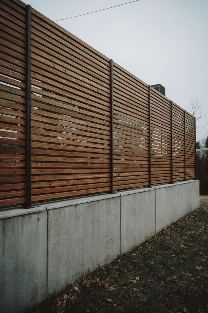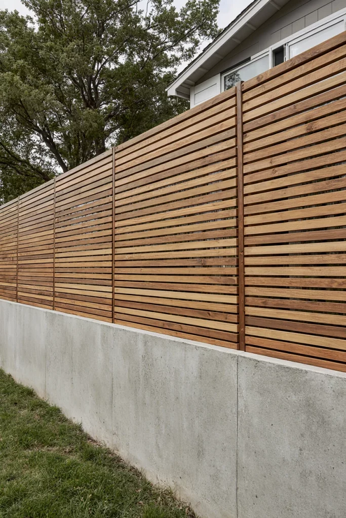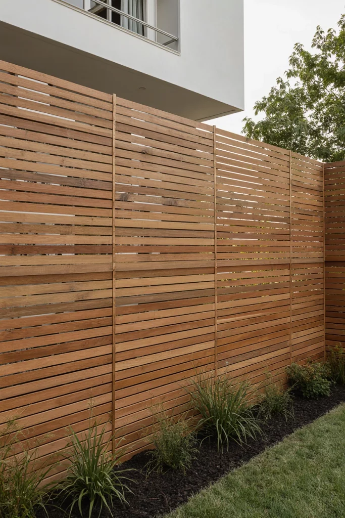 Using horizontal wood is one of the most popular modern approaches today, giving a clean, elegant look that pairs beautifully with any house style. This layout offers strong privacy while making outdoor areas feel wider and calmer. Designers like Emily Henderson often highlight horizontal patterns for their ability to create a warm, natural “wall” that feels intentional rather than heavy.