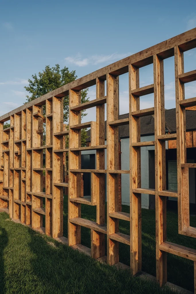 Stacked concrete blocks arranged in repeating patterns create a sculptural, modern boundary. This fence works well for terraced yards or mid-century-inspired homes. With strong visual weight and simple geometry, it brings structure while staying surprisingly versatile across various landscapes.