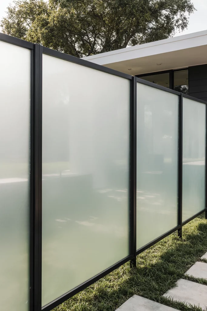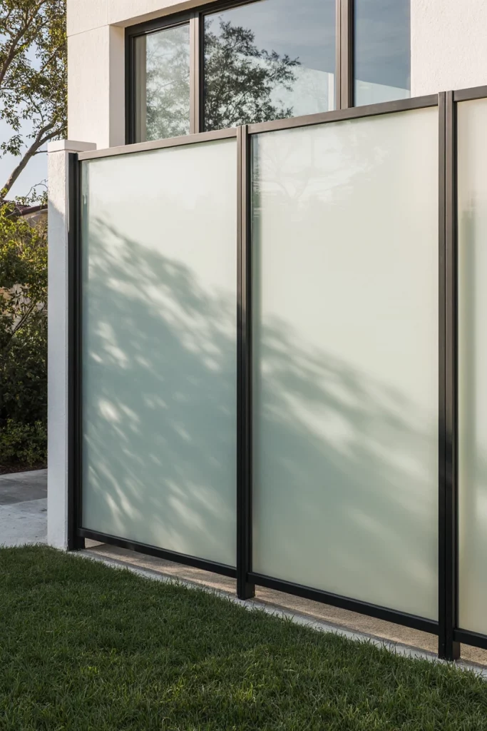 Frosted glass framed with steel or metal gives a sleek, architectural feel while maintaining excellent privacy. It reflects light gracefully and suits upscale homes or compact yards wanting a brighter boundary. Many designers feature this hybrid look as a refined alternative to heavier walls, offering both elegance and modernity.