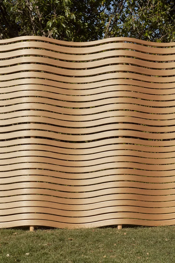 Curved wood slats arranged in a wave pattern bring movement and charm to outdoor areas. This creative idea suits garden paths or pool zones and draws attention without overwhelming the yard. Homeowners love how the organic shape softens modern layouts, blending natural materials with artistic construction.