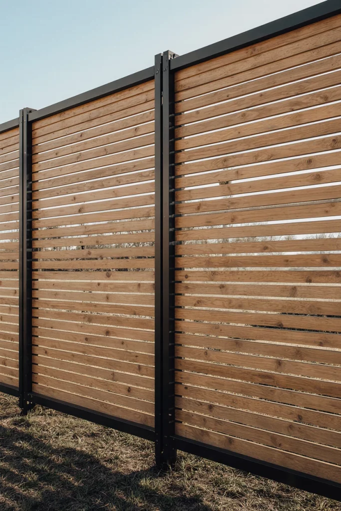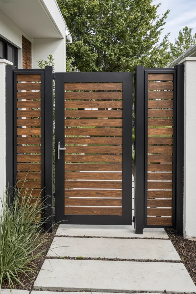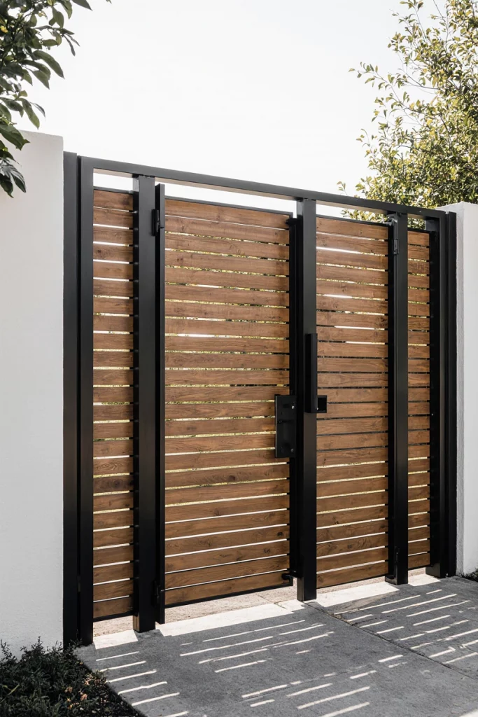 A strong steel structure filled with wooden planks is a favorite for front boundaries and side yards needing extra strength. The metal keeps lines crisp while the wood adds warmth, making it a reliable solution praised by modern renovators. This combination also stays visually balanced through different seasons and landscaping styles.