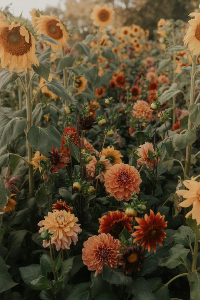 Pair dahlia and sunflowers for a combination that echoes the rich, golden warmth of Klimt’s work—think “The Kiss” translated into flora. Choose burnt orange and deep red dahlias alongside bronze and mahogany sunflowers for a palette that feels both opulent and grounded. This is a favorite among gardeners in the Mountain West and high desert, where these plants thrive in full sun and dry heat. The contrast in flower size and form adds visual drama without requiring a complicated planting scheme.