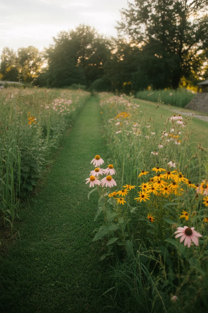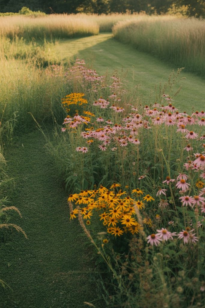 For larger properties, a backyard flower meadow with mowed paths offers the best of both worlds: wild beauty and accessible structure. Seed a section of lawn with native wildflowers, then mow winding trails through it so you can walk and enjoy the blooms up close. This design is trending in the South and Southwest, where drought-tolerant natives like coneflower and black-eyed Susan thrive with little water. It’s a smart move for anyone looking to reduce mowing time while boosting pollinator habitat.