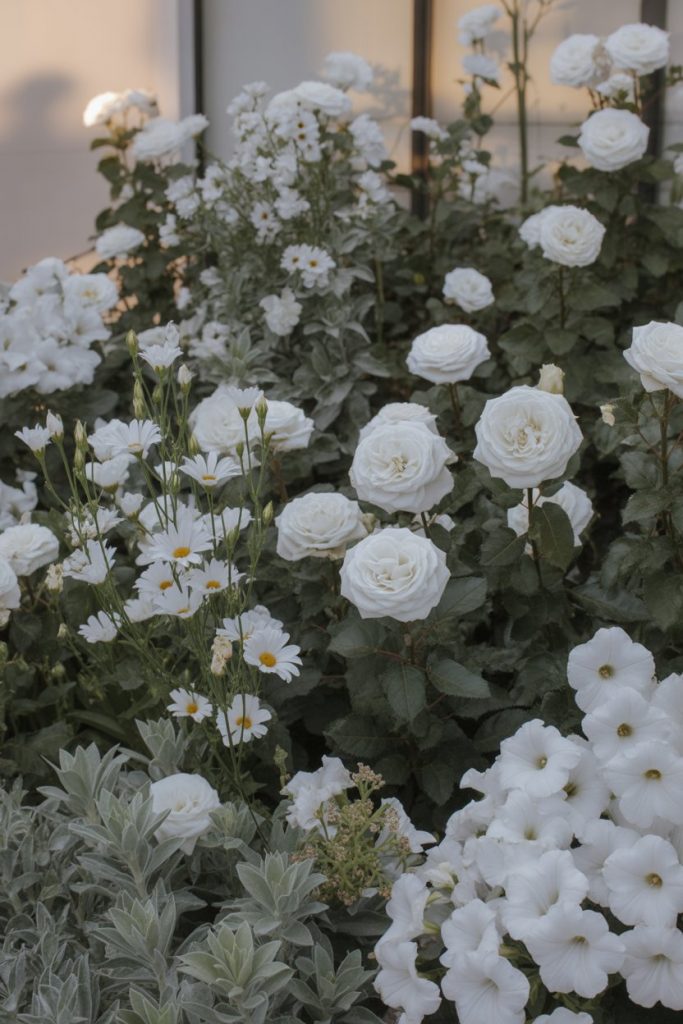 A white flower garden is a study in elegance and becomes almost luminous at dusk. Plant white roses, shasta daisies, and white petunias for a monochromatic scheme that feels formal yet calming. This aesthetic is popular in New England and the South, where evening garden parties are a tradition. The lack of color might seem limiting, but the variety in petal shapes and textures keeps it visually rich. Add silver foliage like lamb’s ear or dusty miller for contrast and depth.