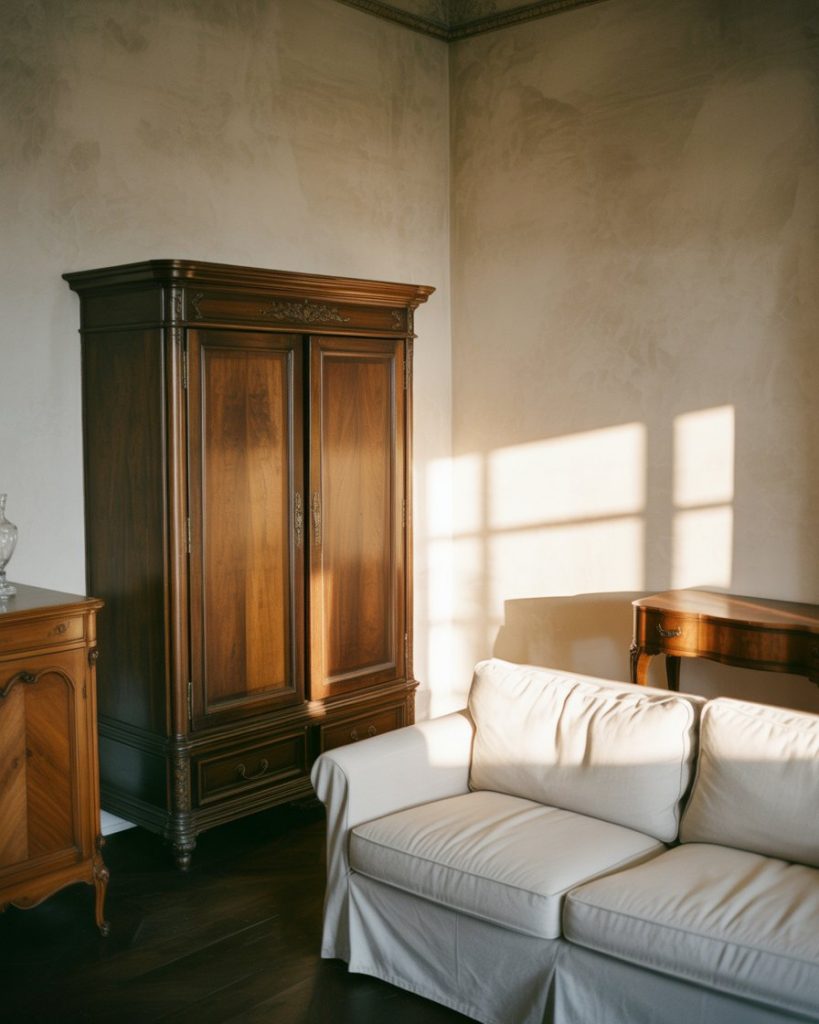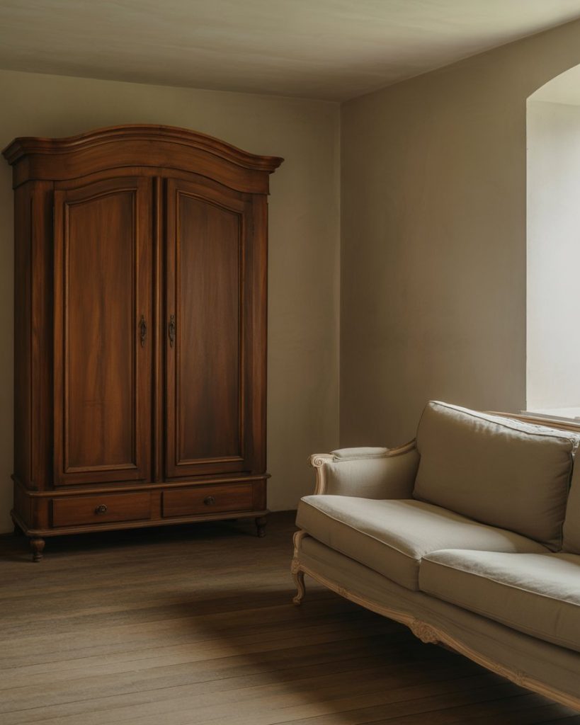 Create drama by pairing dark wood furniture—walnut, mahogany, or ebonized oak—against pale plaster walls. This high-contrast approach feels grounded and sophisticated, anchoring the room with substantial pieces that suggest heirloom quality. The traditional French armoire or buffet becomes a focal point rather than blending into the background. Balance the darkness with plenty of natural light and lighter upholstery so the room doesn’t feel heavy.