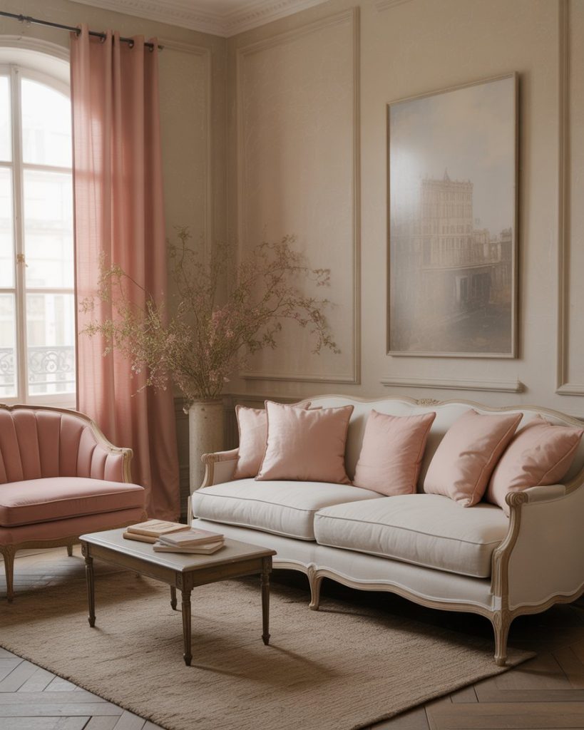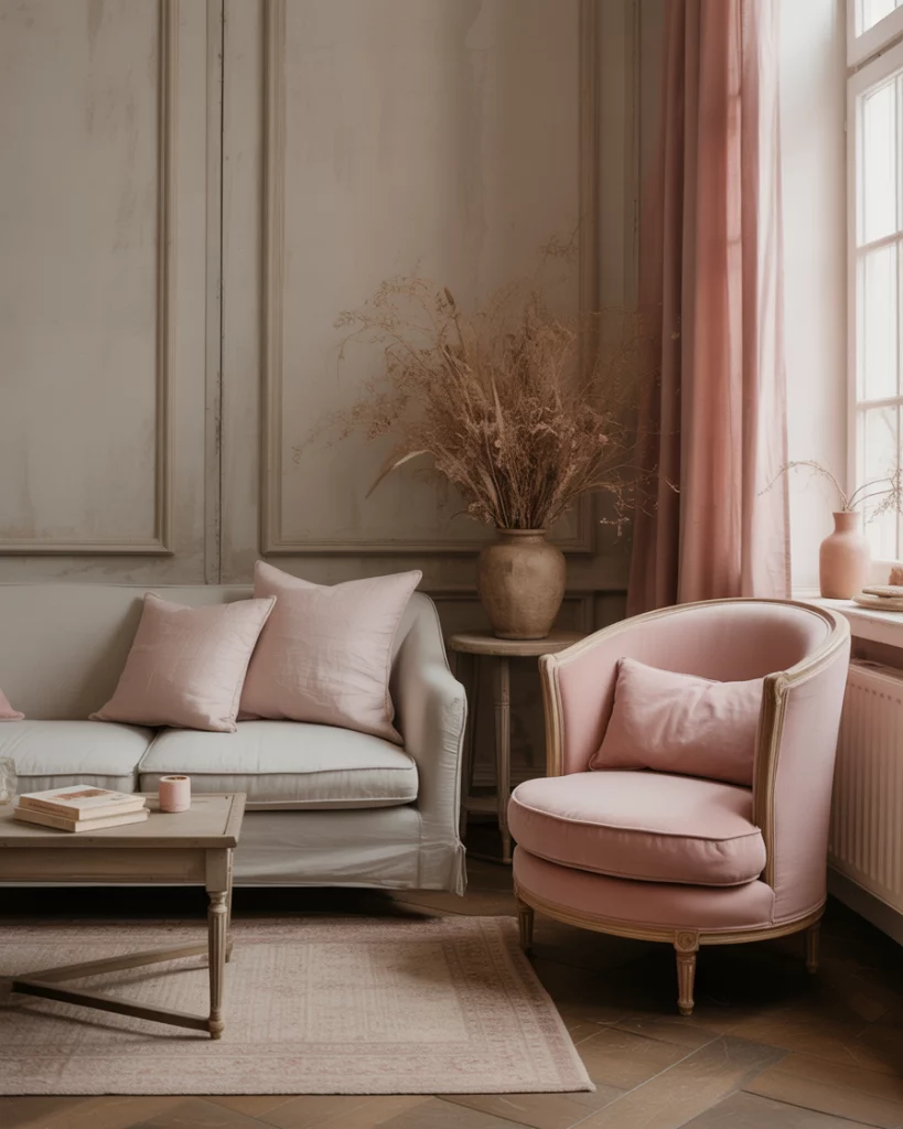 French country embraces subtle pink tones that feel romantic without being overtly feminine. Think blush linen pillows, faded rose-print curtains, or a single upholstered chair in dusty pink velvet. These soft colors add warmth and gentleness to neutral rooms dominated by beige, cream, and gray. The key is keeping the pink muted and dusty—you’re channeling antique textiles and aged roses, not bubblegum or Barbie.
