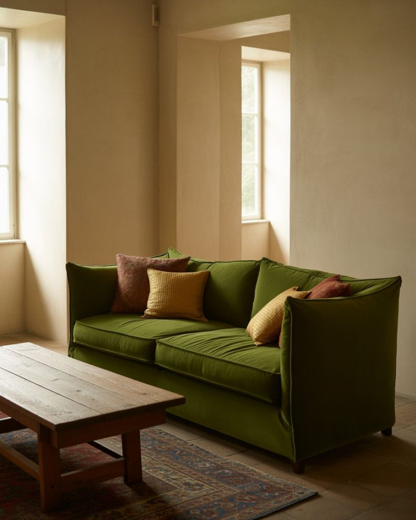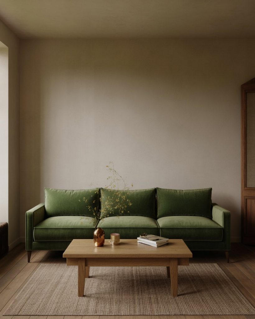 Introduce green through luxurious velvet upholstery that adds immediate texture and depth. Choose forest green, olive, or moss tones that connect to the natural world without being literal. A velvet sofa or pair of armchairs becomes jewelry for the room, catching light and creating visual interest even when the rest of the space is fairly simple. This works especially well in decor schemes where you want one standout element rather than lots of competing details.