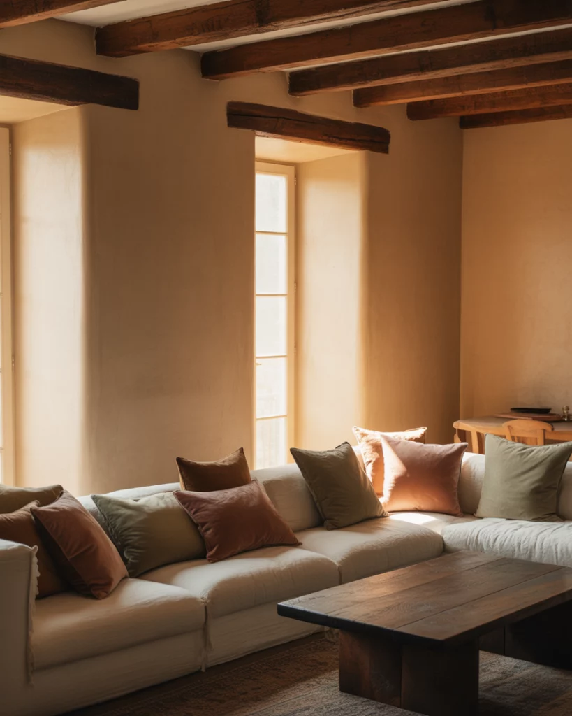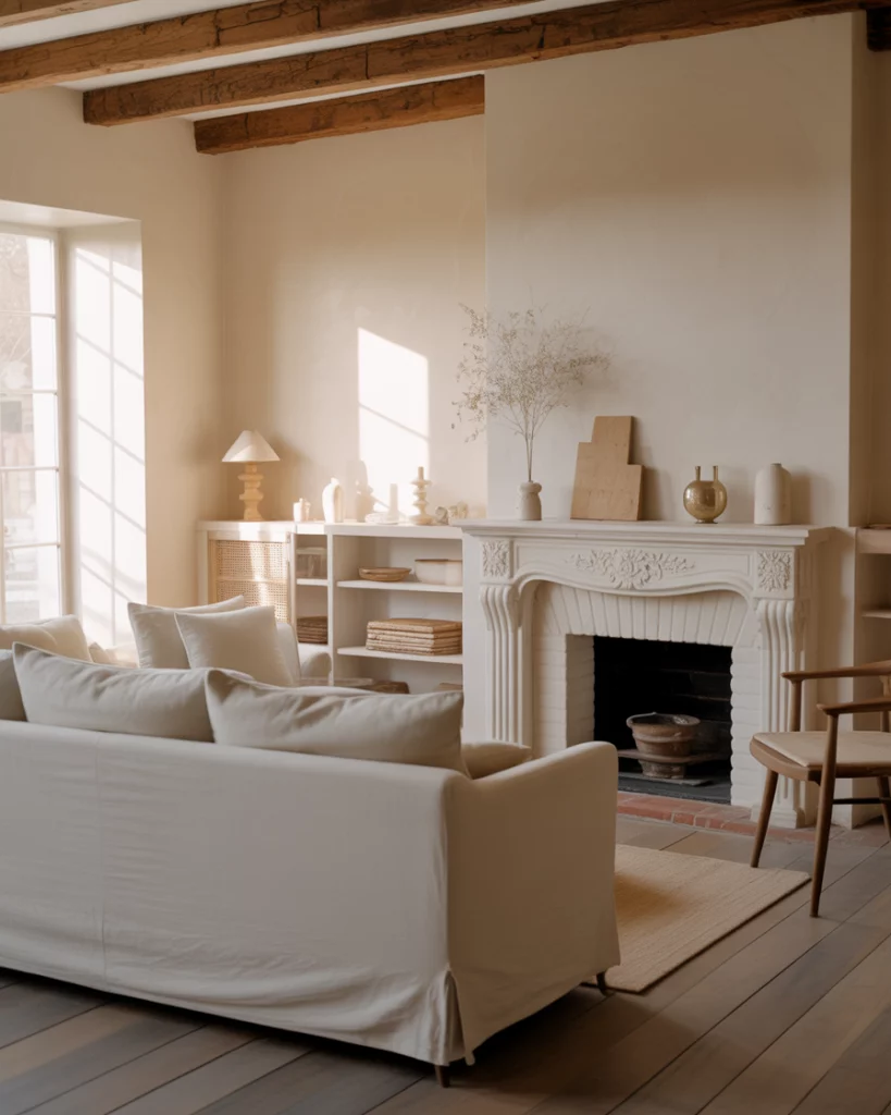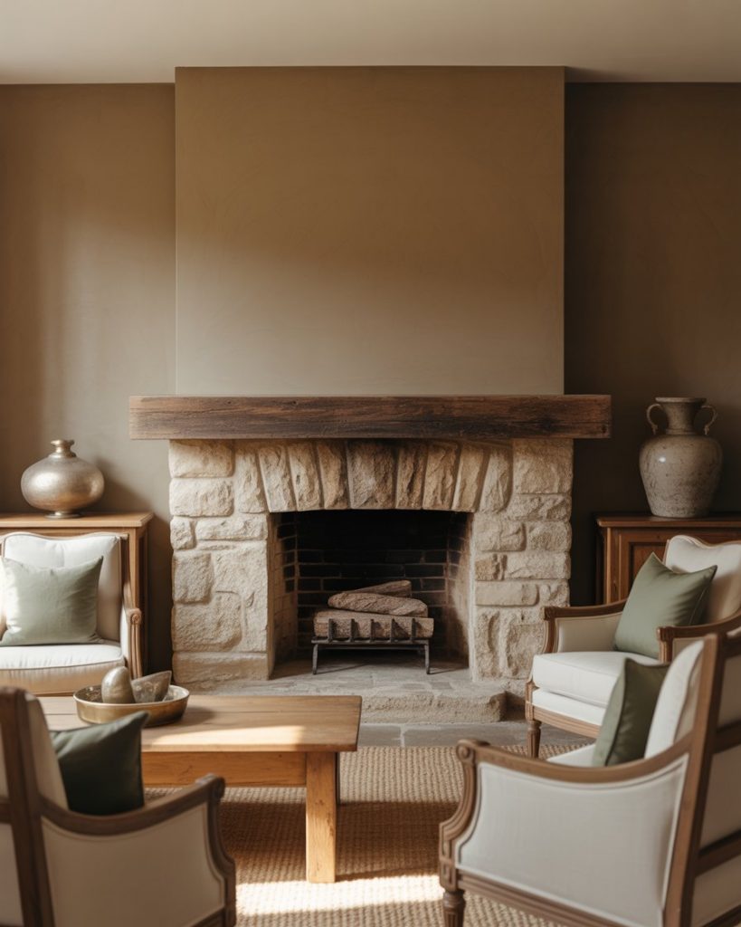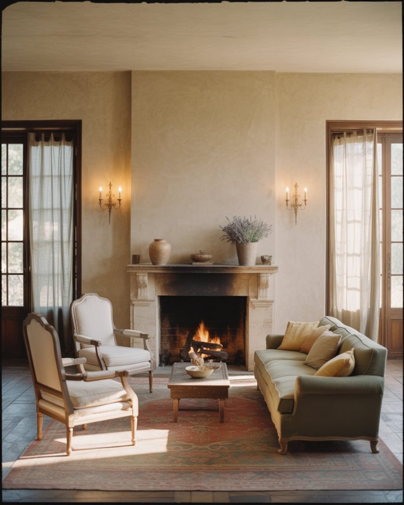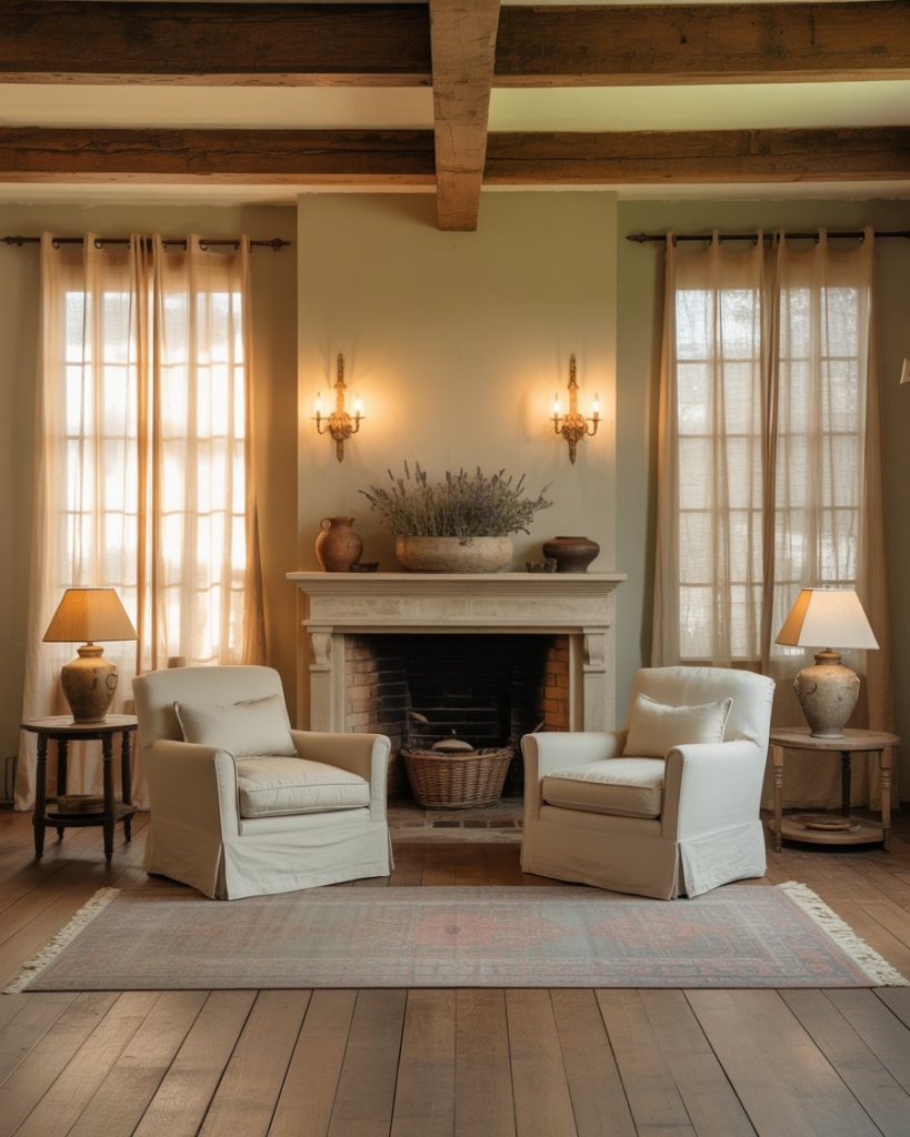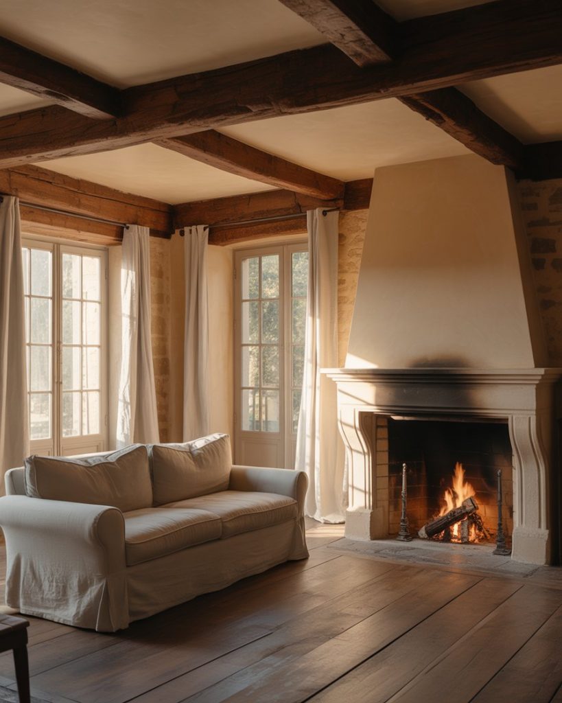 Nothing says French countryside quite like exposed rustic ceiling beams paired with a chunky stone fireplace that anchors the entire room. These architectural elements create instant character and give you a foundation to build around. The key is balancing the heaviness of wood and stone with lighter textiles—think gauzy linen curtains and slipcover seating that keeps the space from feeling like a medieval tavern. Traditional French homes often featured these materials out of necessity, and they’ve aged beautifully over centuries.