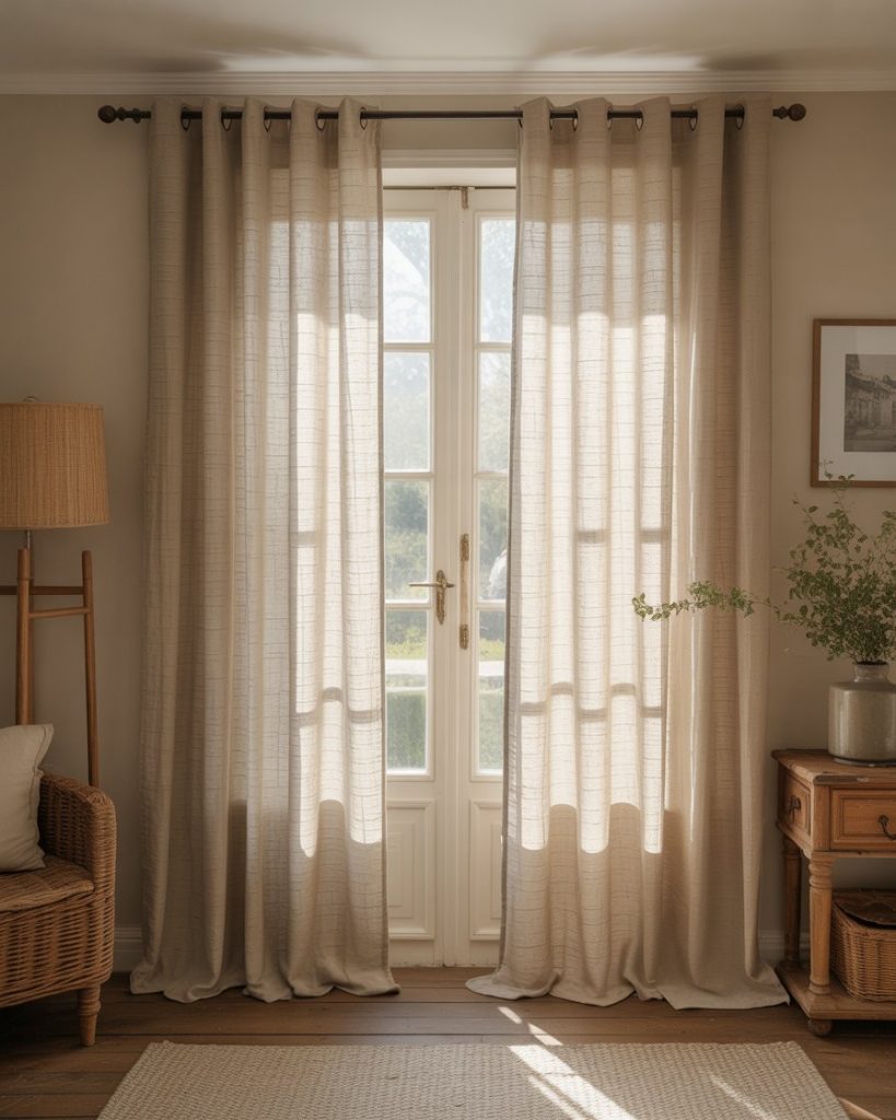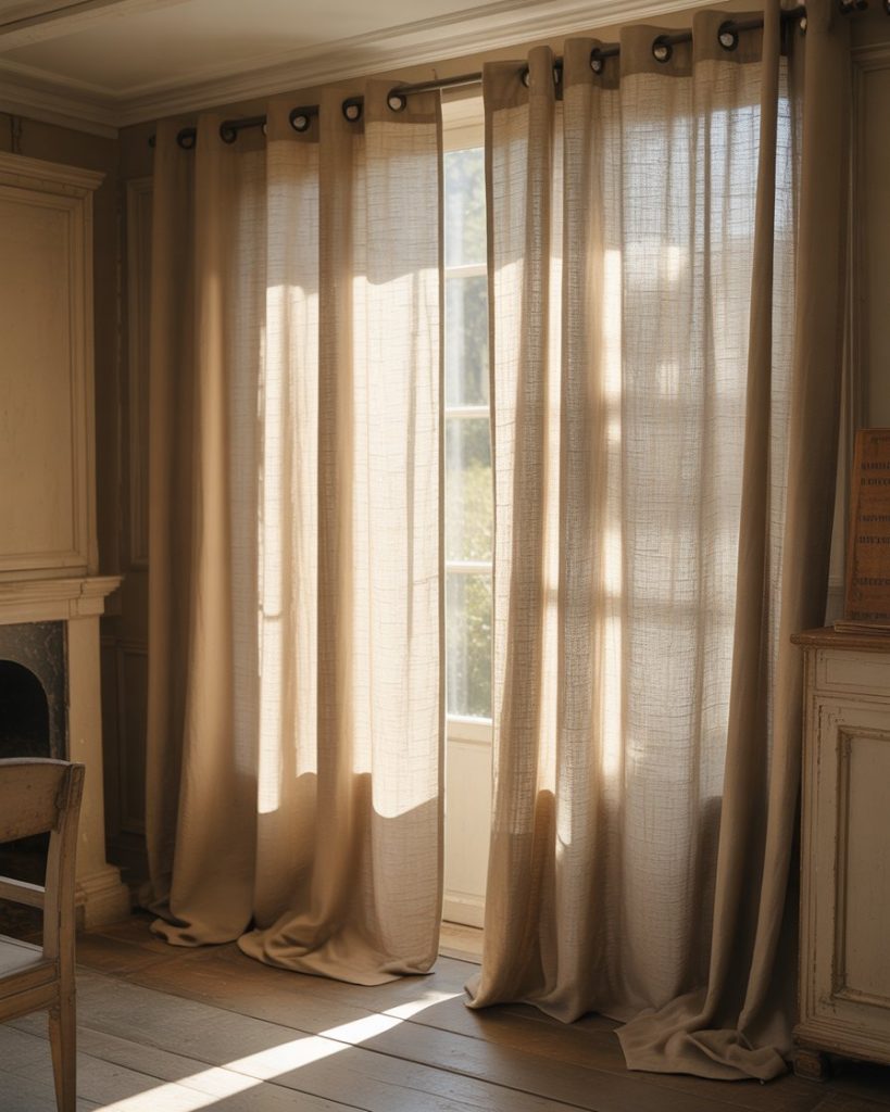 Floor-to-ceiling linen curtains in natural, undyed tones add softness and privacy while maintaining the airy quality French country rooms need. The fabric should have enough body to drape beautifully but enough transparency to let light filter through. Avoid fussy tiebacks or elaborate headers—simple rod pockets or tabs keep the look relaxed. White or oatmeal linen works in nearly every scheme and gets softer with washing.