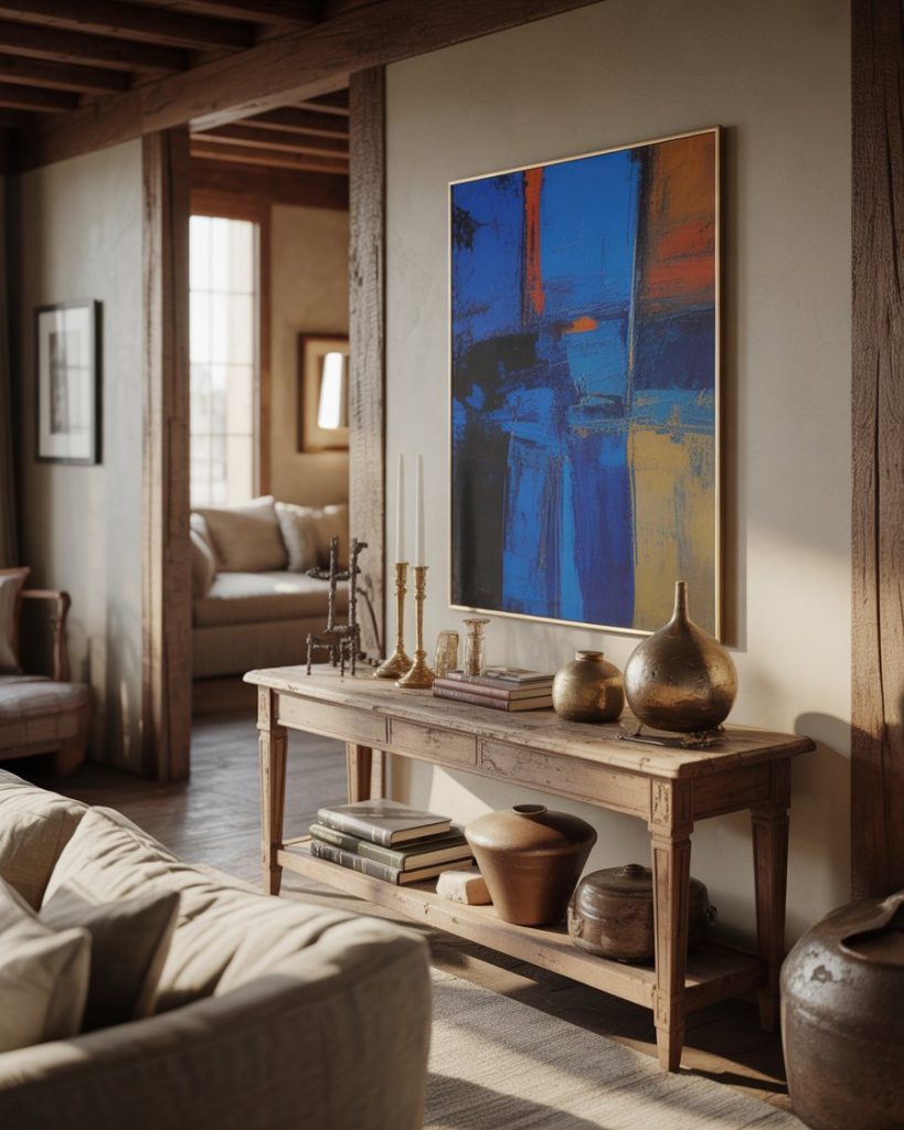 Use French country as your foundation and layer in other decor ideas for a more personal, eclectic result. Add a modern abstract painting above a traditional console, or place a sleek leather chair beside a distressed farm table. The neutral palette and natural materials of French country make it surprisingly compatible with other styles. This approach prevents the room from feeling like a showroom or a literal recreation of a Loire Valley château.