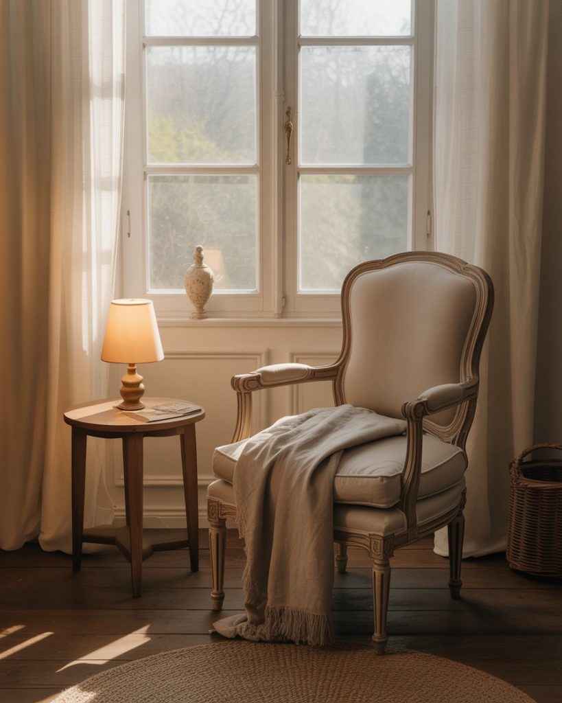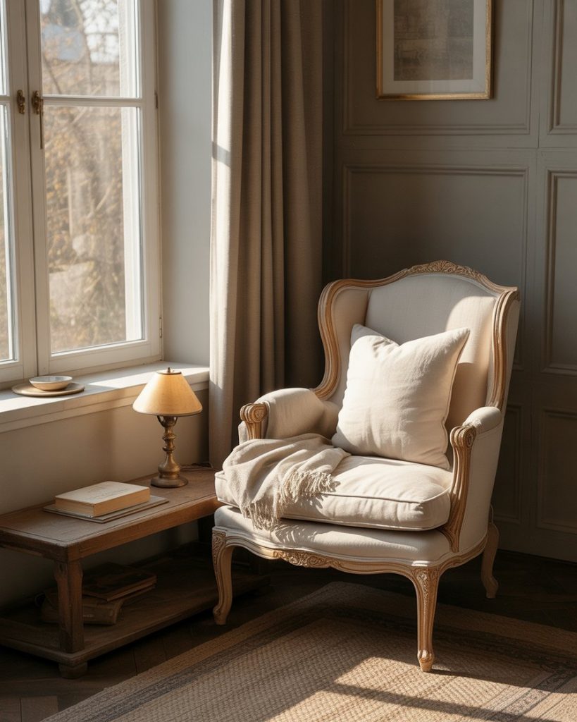 Create cozy reading corners within your living room by carving out intimate zones with French country elements. Position an upholstered bergère chair near a window, add a small side table with a vintage lamp, and layer a soft throw over the arm. These micro-environments make larger rooms feel more inviting and give you dedicated spots for different activities. The French excel at creating distinct zones without actual walls.