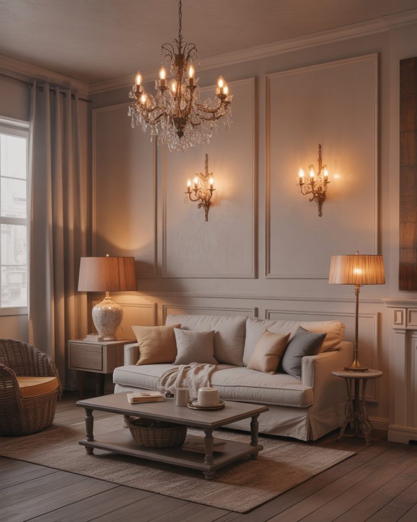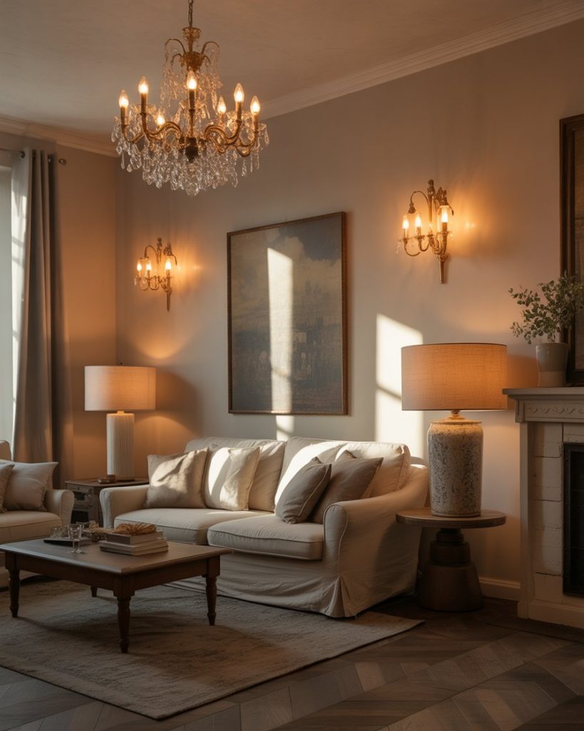 French country lighting should be layered and warm, avoiding the single harsh overhead fixture. Combine a statement chandelier with table lamps, sconces, and even candles for multiple light sources at different heights. Use warm-toned bulbs that mimic firelight, and put everything on dimmers so you can adjust the mood. This creates the same gentle, flattering light you’d find in actual French homes, where overhead lighting is minimal and ambient light rules.