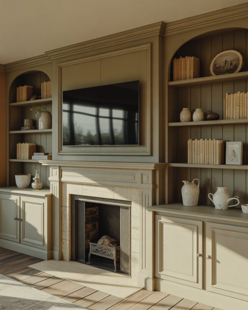 Custom built ins with tv fireplace arrangements solve the eternal problem of where to put the television without sacrificing style. When you paint these cabinets in a soft sage green, they become a design feature rather than just functional storage. The muted green reads as sophisticated and natural, echoing the French love of bringing garden tones indoors. Open shelving on either side lets you display ironstone pitchers, stacks of linen-bound books, and a few carefully chosen ceramics.