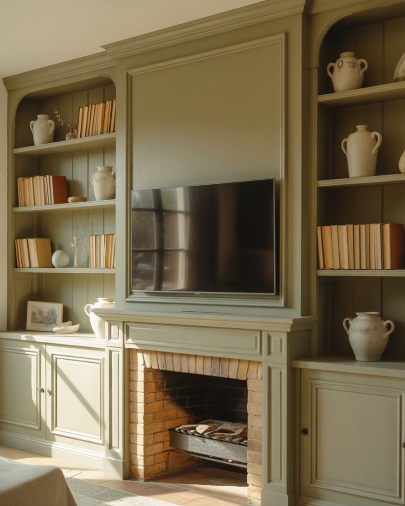 3. Sage Green Built-Ins Flanking TV and Fireplace