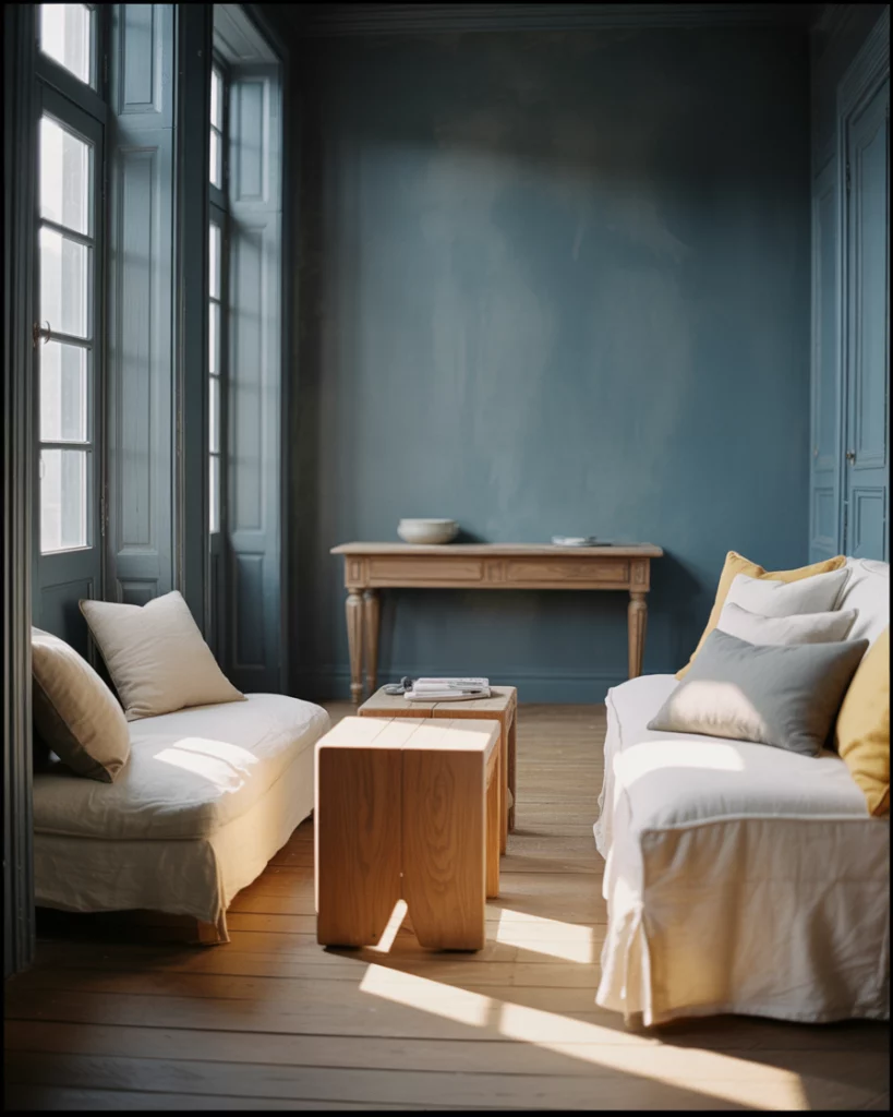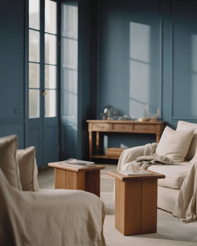 For a more dramatic take on French country, try moody blue walls that evoke twilight in Provence. This isn’t the bright cerulean you see in coastal spaces—think deeper, dustier blues like faded denim or stormy skies. Balance the intensity with plenty of warm wood tones in furniture pieces: a walnut console, oak side tables, maybe a fruitwood armoire. The contrast between cool walls and warm wood creates depth and keeps the room from feeling one-note.