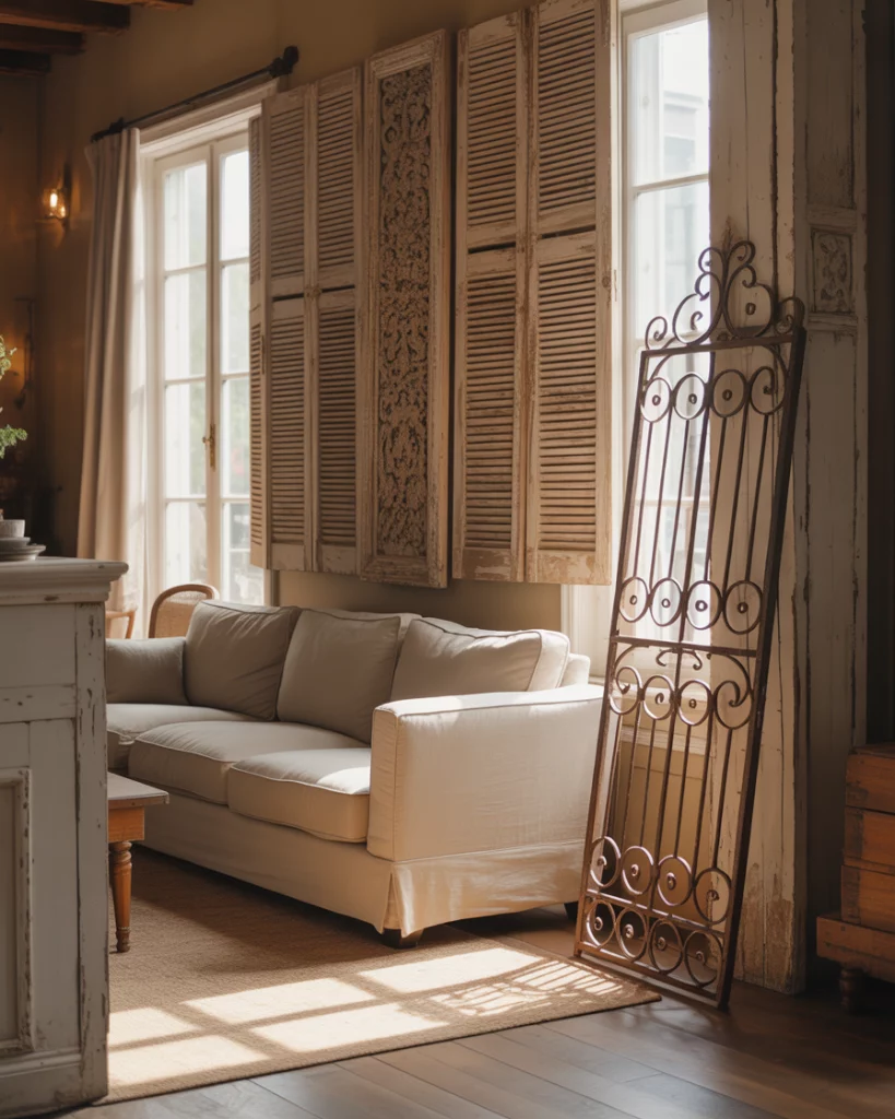 Solve the perennial question of wall decor ideas above couch by mounting architectural salvage pieces instead of traditional art. An antique window frame, carved wood panel, or wrought iron gate creates instant impact and connects to French country’s love of repurposed materials. These pieces have presence and scale that fill large walls without requiring a gallery of smaller frames. The three-dimensional quality adds depth that flat art can’t achieve.