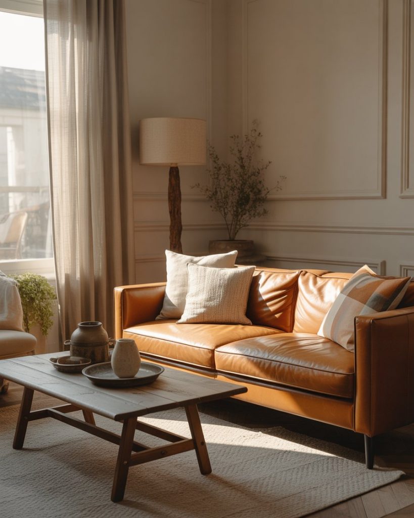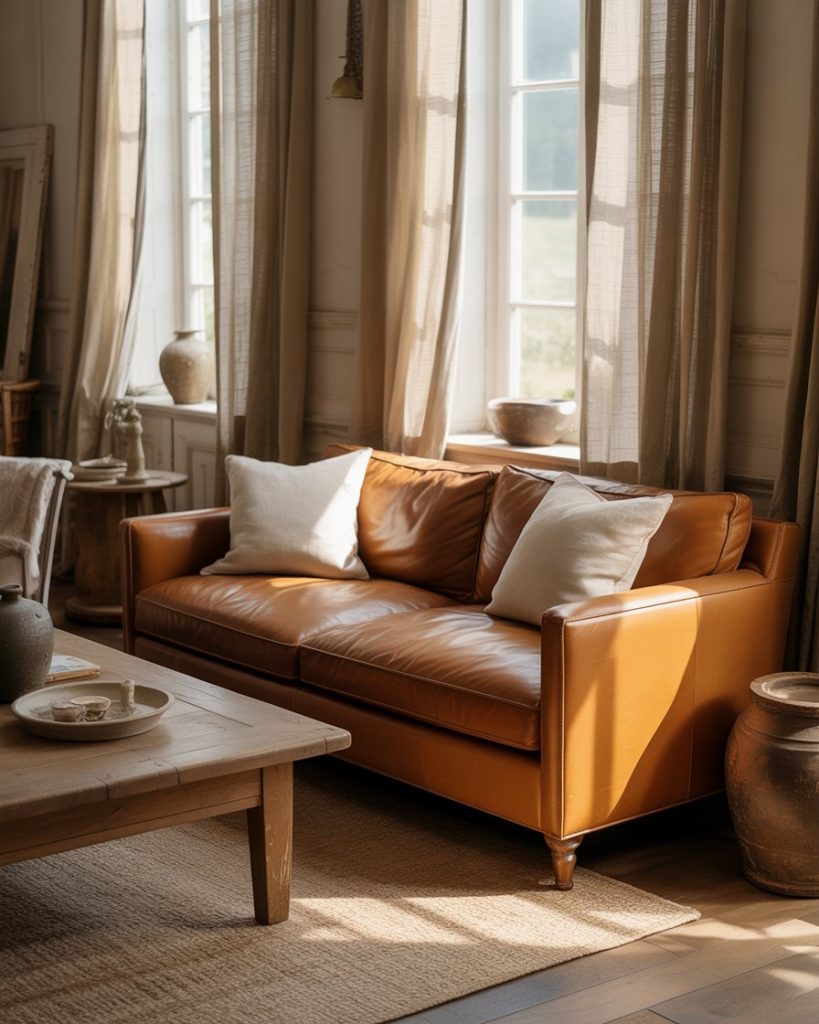 While linen gets all the glory in French country rooms, a quality leather couch can be equally at home in this aesthetic. Choose caramel or cognac tones that age beautifully and develop character over time. The leather adds a masculine edge that balances out softer elements like ruffled curtains or floral pillows. This is particularly smart in homes with kids and dogs, where white linen would be a daily stress rather than a design choice.