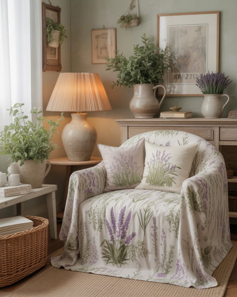 Where it works best: sunrooms, breakfast nooks converted to sitting areas, or any space with direct garden access. The style feels most authentic when you can actually see growing things through the windows. A Michigan homeowner I know keeps potted herbs on her windowsill year-round, and the living herbs tie directly into her dried lavender arrangements—it’s garden living even in January.