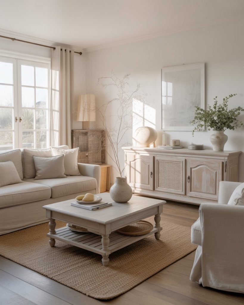 This palette is especially popular in coastal California and Florida, where the white echoes beach tones while the French details add sophistication. One common pitfall is making everything too bright and sterile—you need those warmer cream tones to prevent the room from feeling cold. Natural fiber rugs in jute or sisal add warmth underfoot and break up all that white visually.