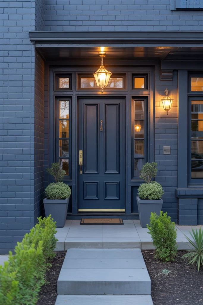 Enjoy how a deep blue door elevates a gray or tan house. It’s chic and dramatic without being overpowering. Designers love the confidence this color gives paired with brass accents and clean lines. The even smaller porches feel intentional with this color, especially blue vertical elements illuminated at twilight. The cinematic glow of dusk blue is warm and inviting; even the most selective of neighbors notice the confidence.