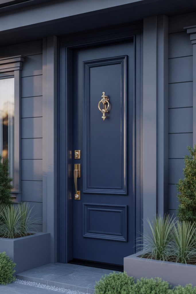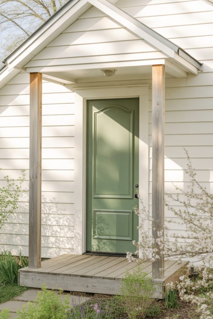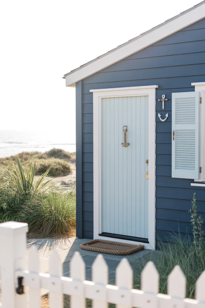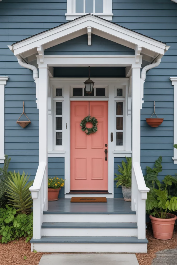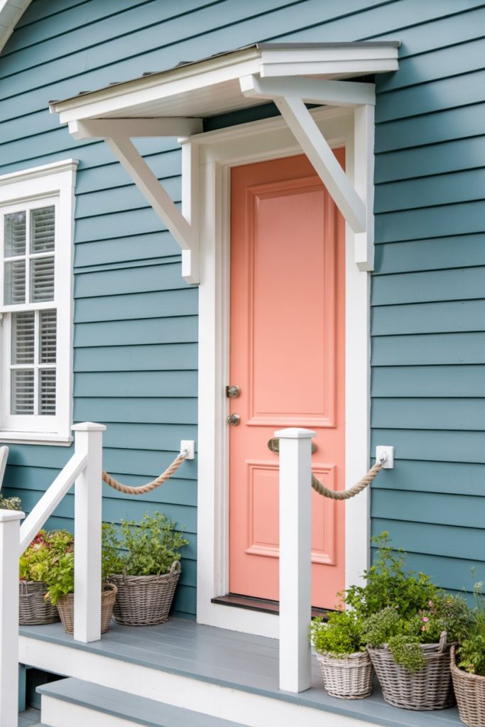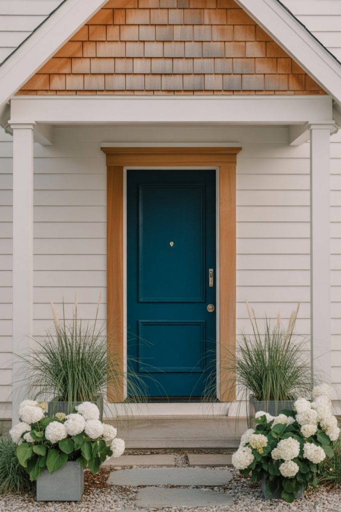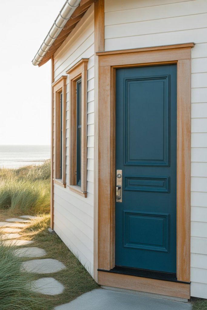 If you already have blue siding, try a tone-on-tone door just a shade lighter or darker. The effect is soft and coastal, like the overlapping colors of sea and sky. Designers in New England swear by this approach for cottages, lake houses, and breezy porches with rope accents or driftwood details. It’s an easy way to stay colorful without clashing, especially if your home is already near water or styled like it is.