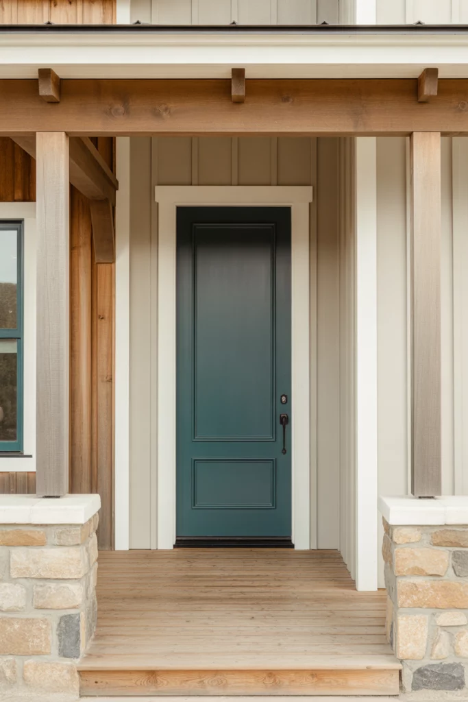 Storm teal is a mix of blue and green, deeper than aqua but softer than navy. It looks stunning on a white house with natural wood beams or a coastal build near water. Designers love teal because it shifts in different light—sometimes cool, sometimes warm. It’s an excellent pick for homeowners who want personality without neon intensity.