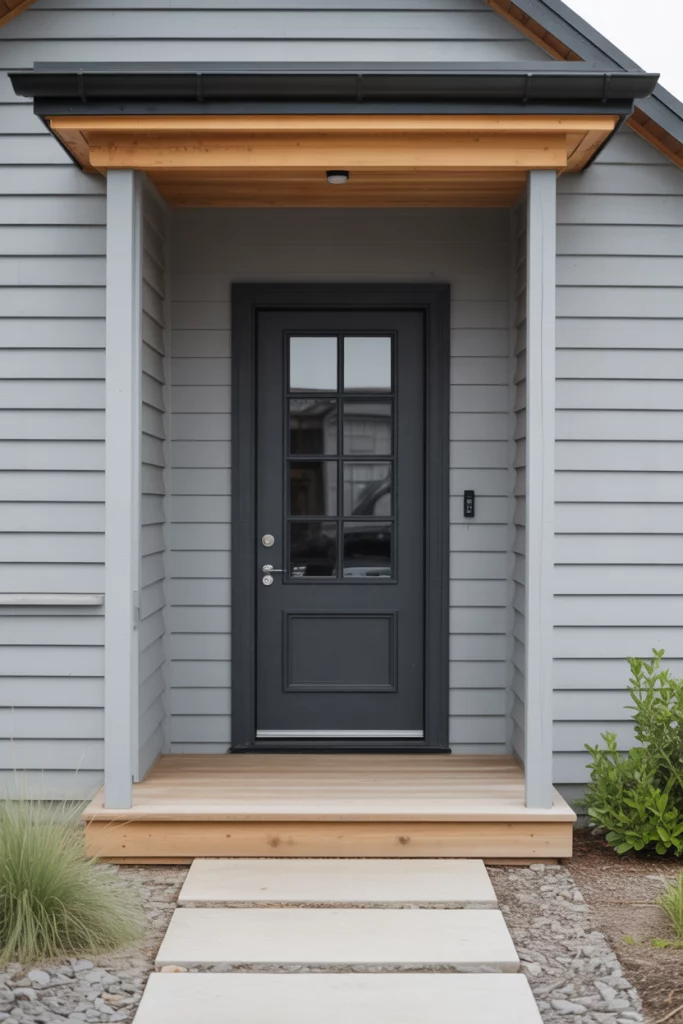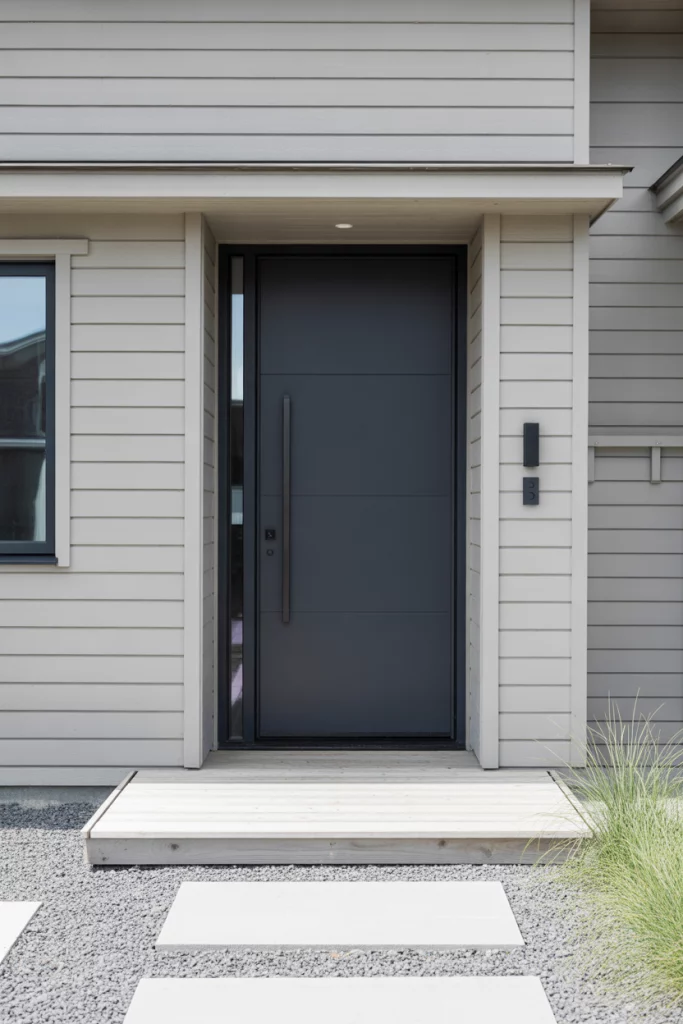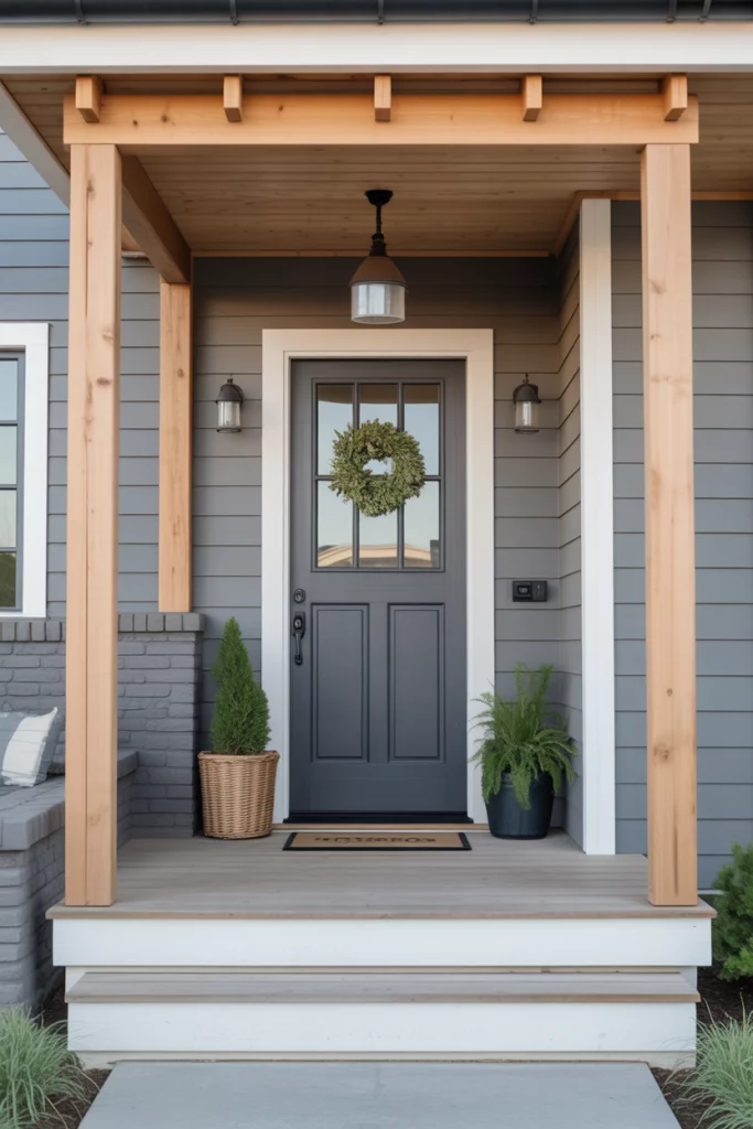 The combination of a darker gray door against lighter gray siding has captured a minimalist target for 2026. The appearance is clean, architectural, and without unnecessary elements—ideal for Scandinavian-style ranches or urban constructions. The secret is to select a mild contrast so that the door is readable but not offensive. Graphite or brushed steel hardware balances the ensemble’s quiet, contemporary feel. This is for those who appreciate “design fluency” without a riot of color.