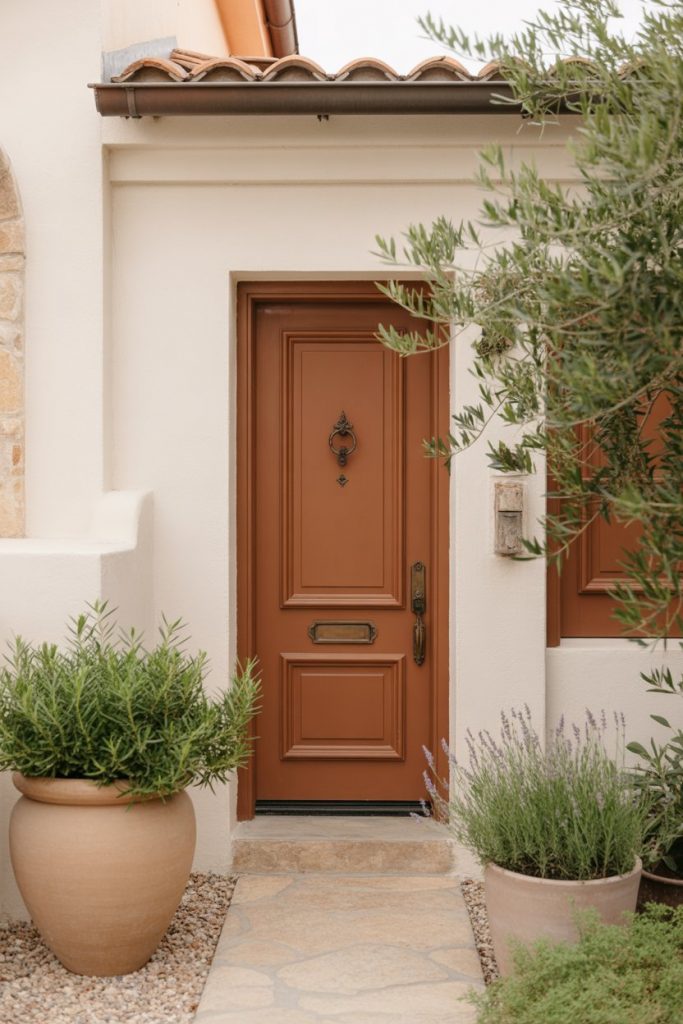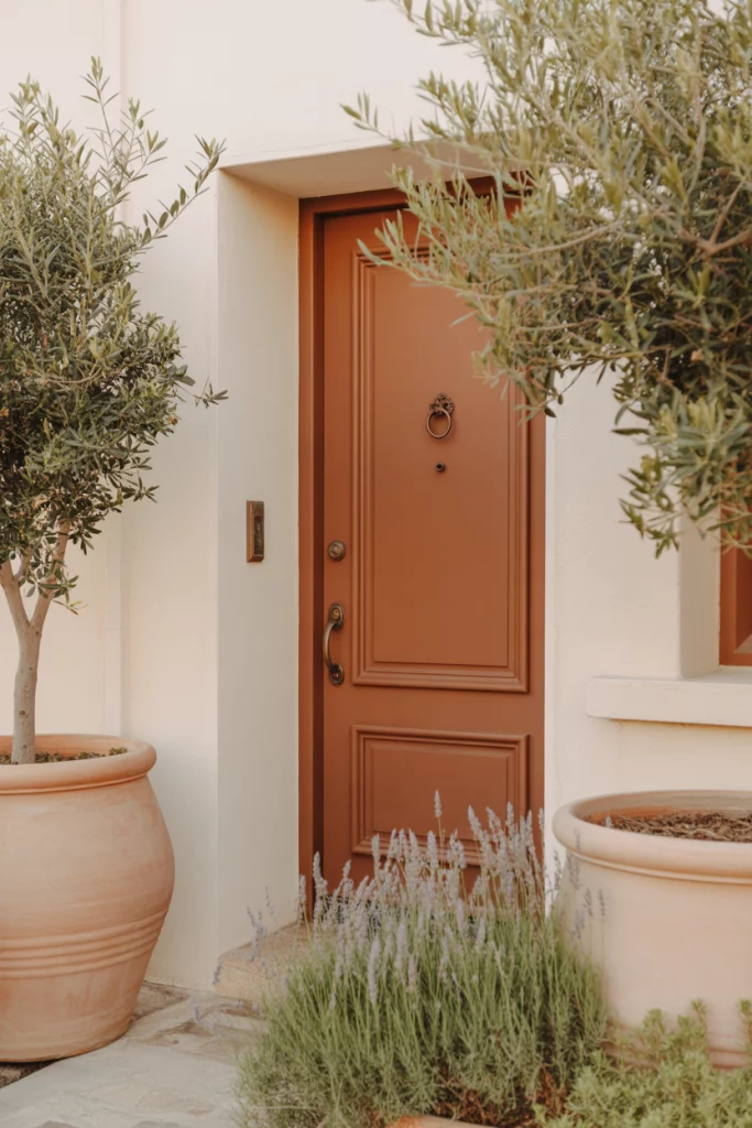 As you match terracotta doors with a white house or beige house, you begin to appreciate the Mediterranean warmth it brings. Paired with clay pots and warm metal fixtures, the ambience stands out. The color is as if handmade and sunbaked, like something out of an old Italian village. For those looking for earthy character but wishing to avoid darker tones, this is a great option. It adds character to modern and minimalist tones in the structure, making it approachable as well as lived in, while still exhibiting an expensive, curated feel.