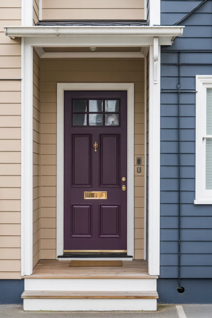 A deep plum or eggplant hue works perfectly, providing a bit of depth or balance to your house without using the heaviness of black. It works especially well on gray siding or a tan house that needs depth. It is best suited to transitional homes for designers, those that mix classic trim with modern lines. The shade feels artistic, like a gallery entrance, and looks stunning with brushed brass knockers. At best, it is the door color where people would most readily ask, “What’s inside?” in a pleasant manner.