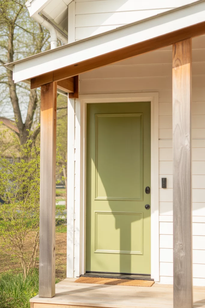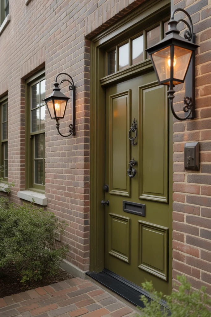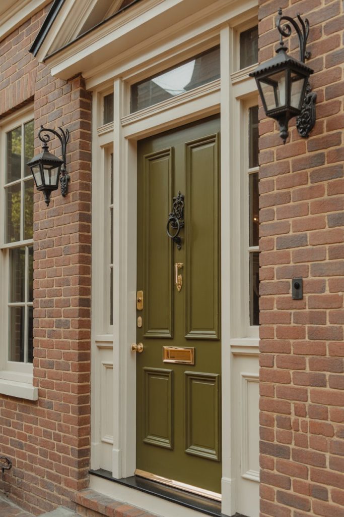 A muted olive looks refined on a brick house, brown house, or historic colonial. It carries an old-world charm that blends with aged mortar, copper lights, and iron railings. Unlike bright greens, olive behaves like a neutral—calm, rooted, traditional. Think English countryside but adapted to American suburbs. It’s the type of door color that makes a home feel established, even if it was built last year.