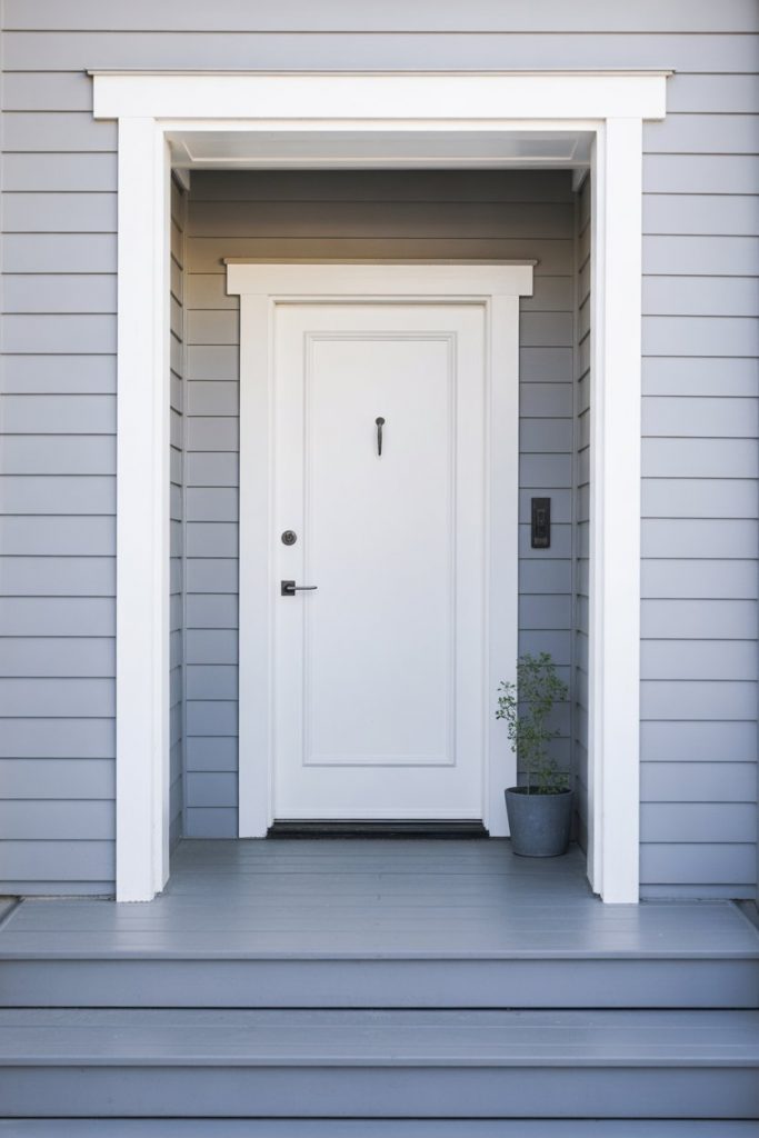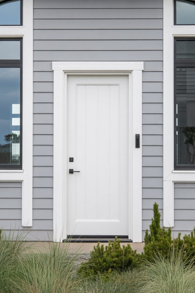 A crisp white door sounds simple, but on a gray house or blue siding home, it creates a fresh, airy contrast that feels modern and spotless. White doors reflect sunlight, making porches look bigger, and they pair well with black or gold hardware. Homeowners who love Scandinavian or coastal minimalism often choose this color because it feels like a reset button for the entire façade.