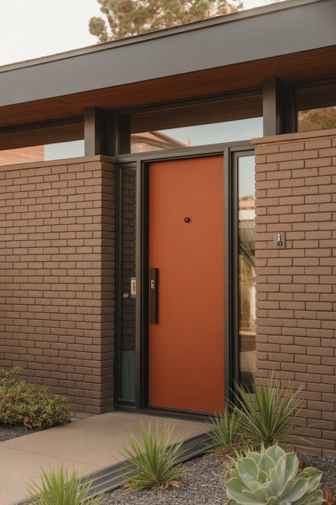 Burnt orange channels 1970s style in the best way—warm, nostalgic, and unmistakably confident. It works well on a mid-century ranch or brown brick home with reclaimed wood accents. Paired with matte black fixtures, it feels updated rather than costume-like. If you’re into vintage vinyl, classic cars, or Eames furniture, this shade will feel right at home.