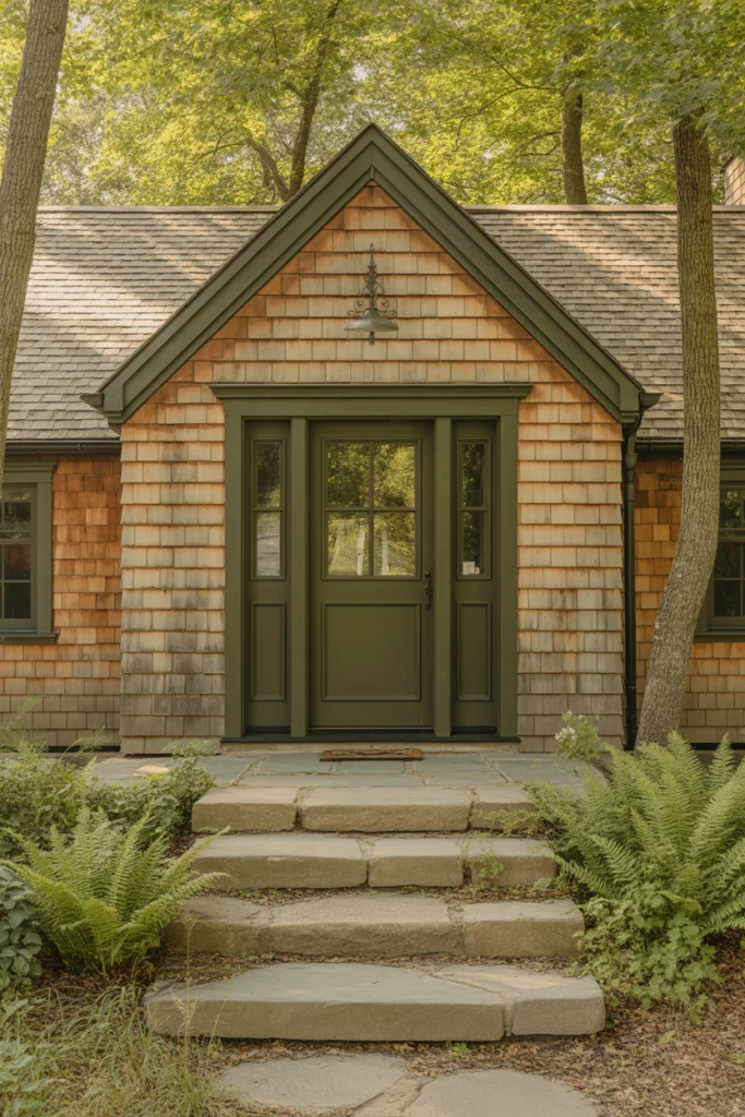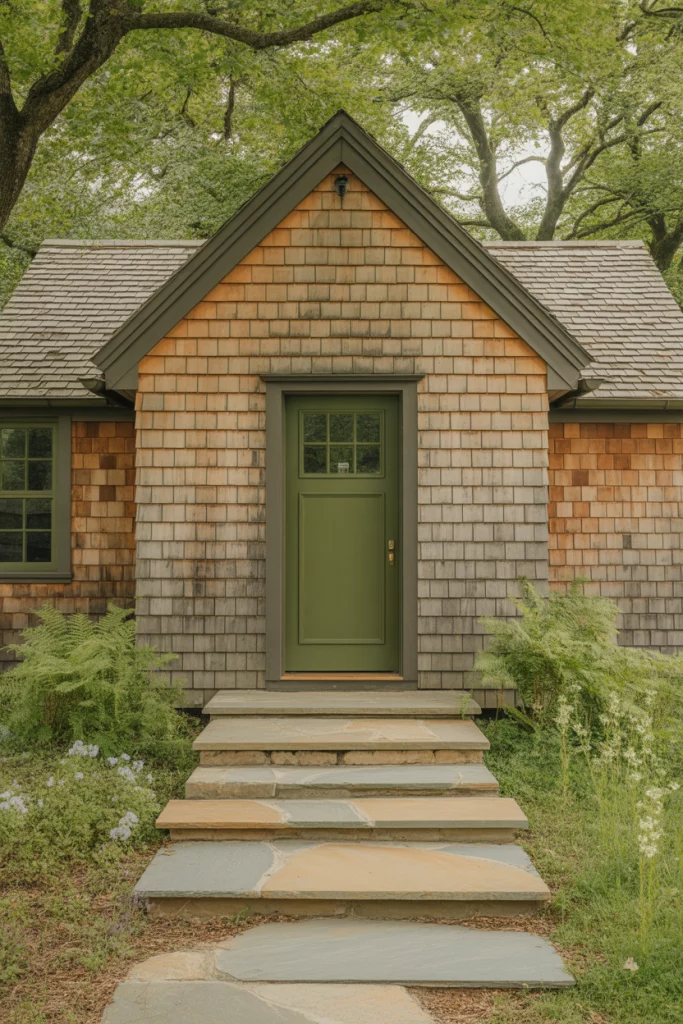 Heavier than sage green and earthy, moss green beautifully pairs with stone paths, cedar shingles, and wooded lots. It gives farmhouse- or cabin-style homes an aesthetic look, making it seem like they belong to nature rather than sitting on top of it. This shade makes the whole house feel grounded, which is why it is loved by homeowners who enjoy hiking, gardening, and peaceful porches.