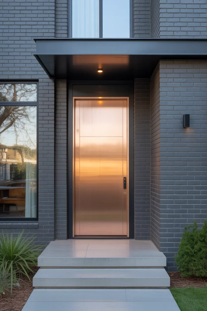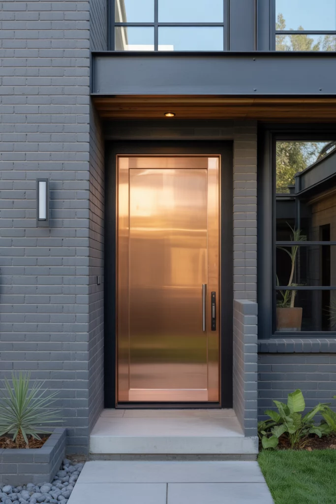 Doubling as an industrial-style accent, a real or faux copper door gives instant luxury. It beautifully contrasts a grey house or modern concrete build and works as jewelry against a neutral surface. Patina copper doors age beautifully, transitioning to a soft green-bronze and adding evolving character to an abode. It’s a bold feature that truly stands out.