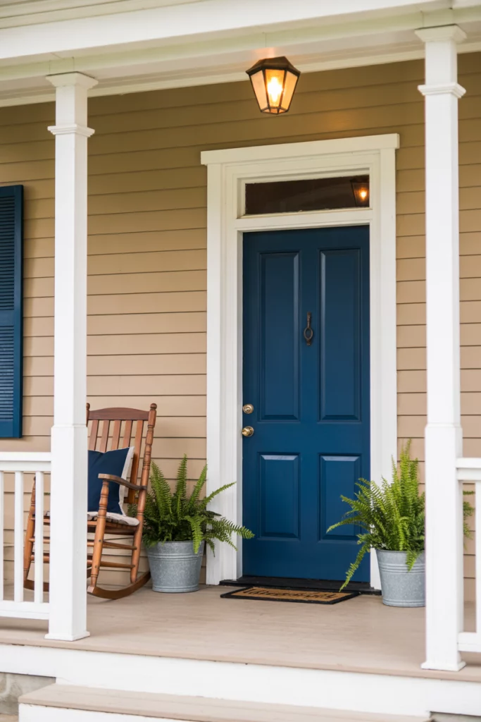 Softer than navy, denim blue gives a tan house or white house a relaxed, friendly, all-American look—like your favorite broken-in jeans. It works with wicker rockers, striped rugs, or farmhouse lanterns. This shade bridges traditional and casual, which is why it shows up on porches from Maine to Montana.