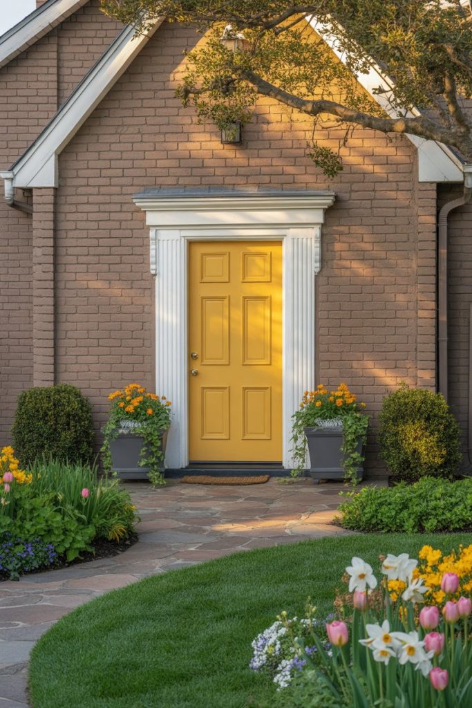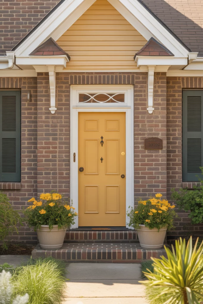 A soft yellow door can turn even a brown brick or brown house into the happiest entry on the block. Real estate stagers love it because buyers subconsciously associate yellow with good energy and warmth. The shade works especially well in regions with long winters, where homes need extra brightness. Pair it with crisp white trim or muted stone, and you get a friendly pop that still ages gracefully instead of looking cartoonish.