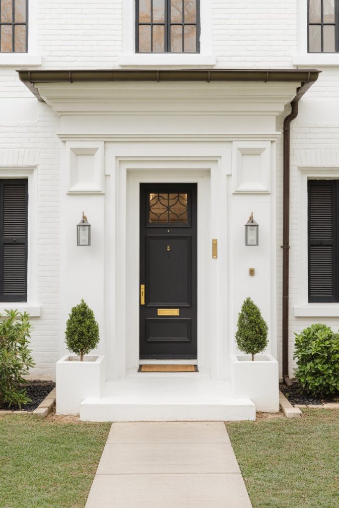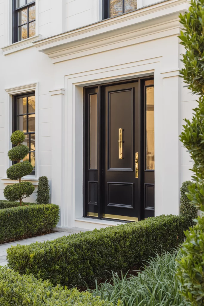 A black front door is the definition of bold without being loud. It gives a white house instant contrast and makes a beige house look intentionally styled. Realtors often recommend black because it signals timeless elegance; it works for colonial homes, loft-style entries, and modern cubes alike. Add gold or chrome hardware, and the whole scene reads “quiet luxury.” No surprise, black shows up in almost every high-end listing photo.