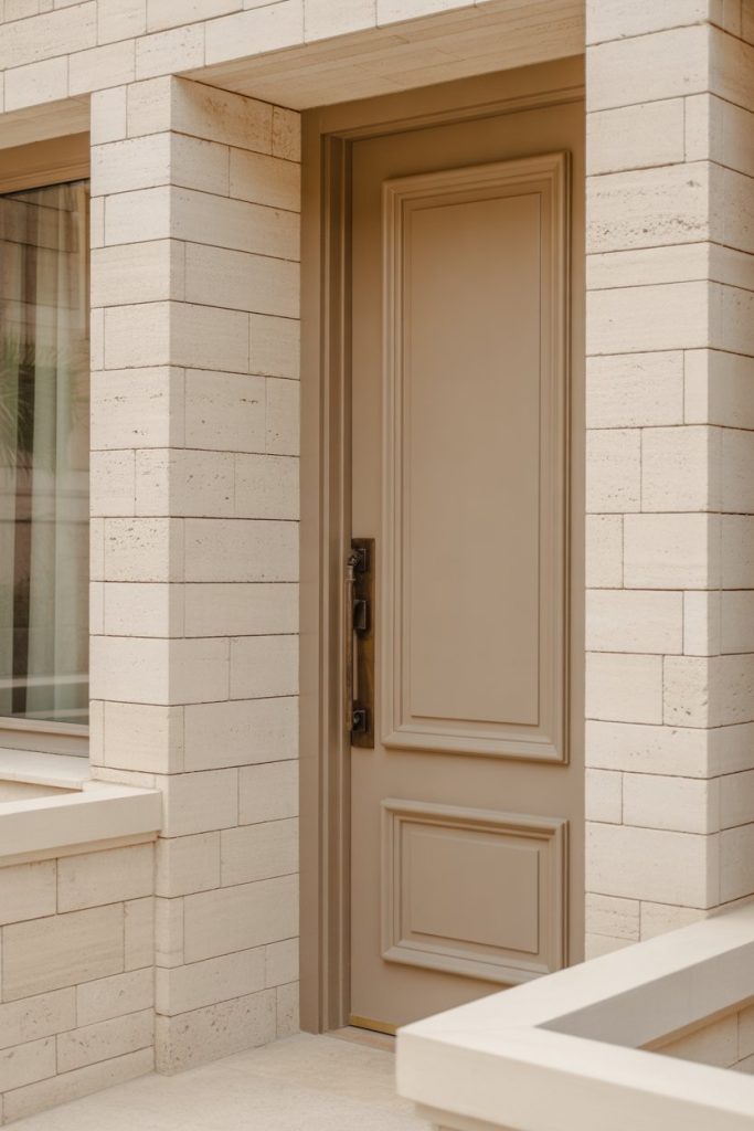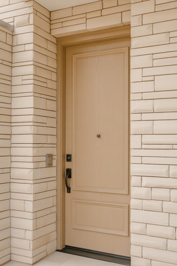A beige door on a beige house may sound risky, but tonal layering is trending hard in 2026. The look is borrowed from European villas and updated by designers like Amber Lewis, who love subtle luxury. The effect feels calm and expensive, especially on stone or limewashed facades. Warm brass and pewter hardware provide the necessary detail so the door doesn’t fade into the background. Beige, once mocked as boring, is now “the whisper that wins.”